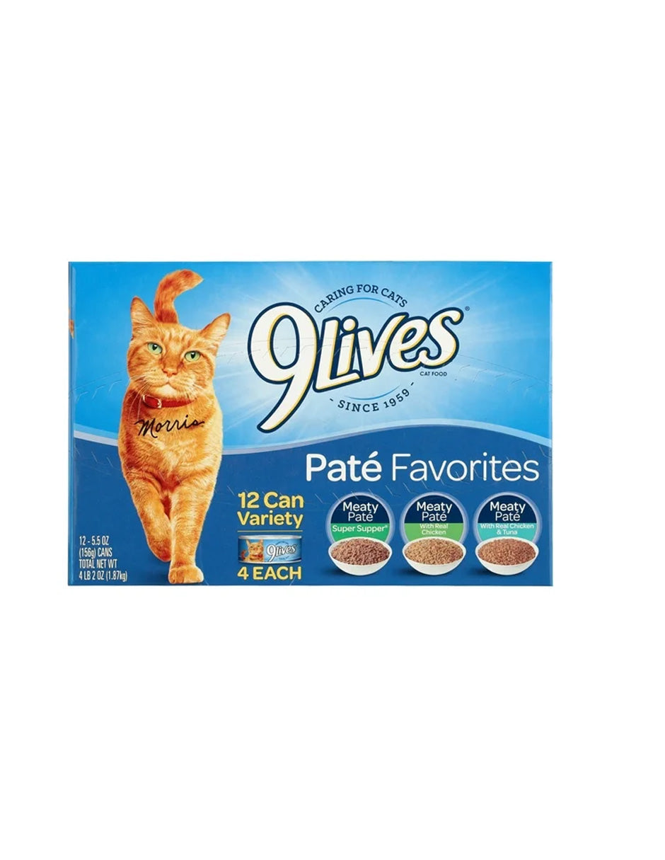 Alimento húmedo para gatos 9Lives en Paté sabores Pollo, Atún 12 Latas de 5.5oz