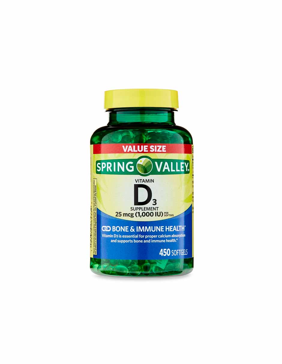 Spring Valley Vitamina D3 cápsulas blandas, 25 mcg (1000 UI), 450 unidades