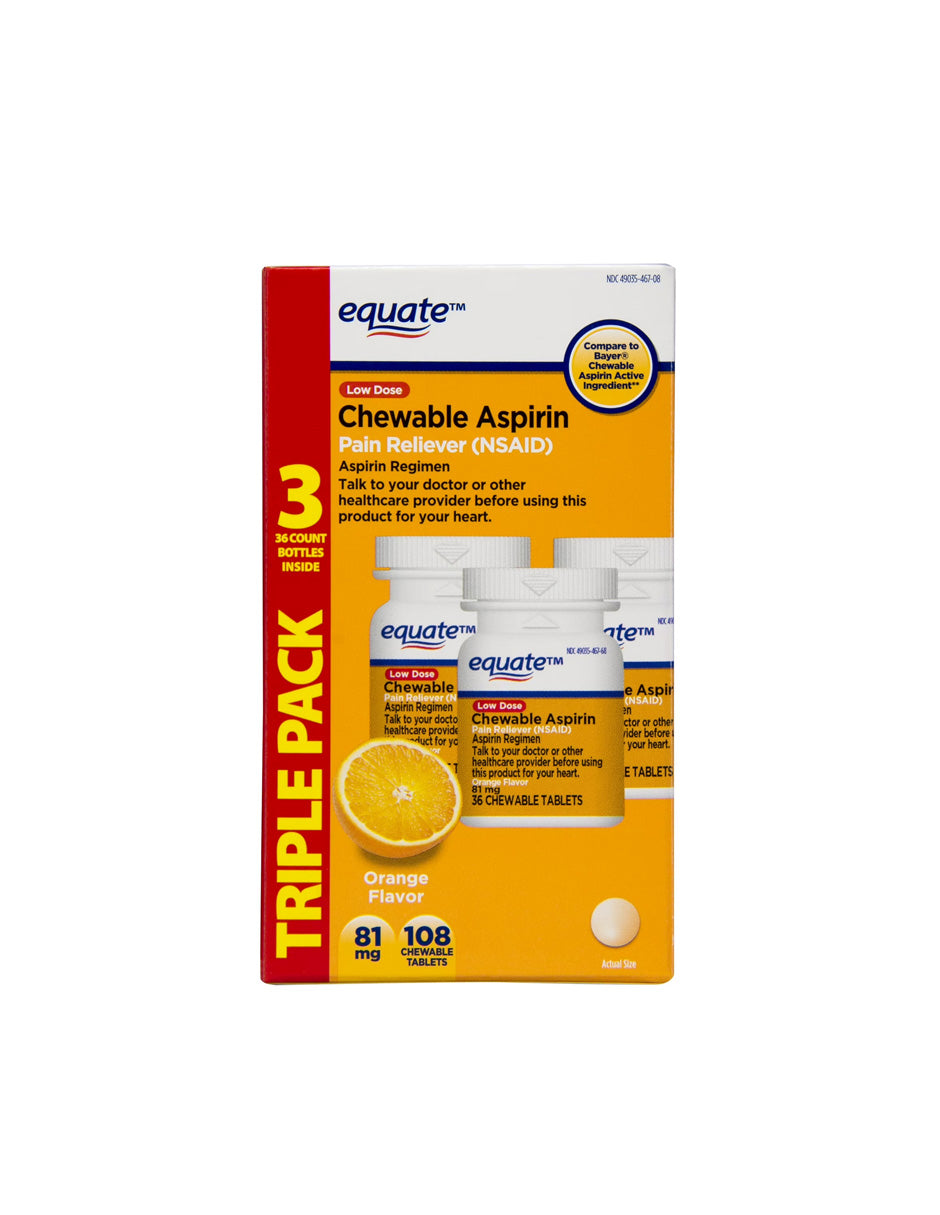Alivia dolores leves con estas tabletas masticables de aspirina en dosis baja de 81 mg, con agradable sabor a naranja. Comparables con Bayer Masticable, estas tabletas son ideales como parte de un régimen recomendado por un profesional para adultos que requieren cuidado cardiovascular. Sin gluten. Presentación de 108 unidades (3 frascos de 36 tabletas). Para adultos y mayores de 12 años.