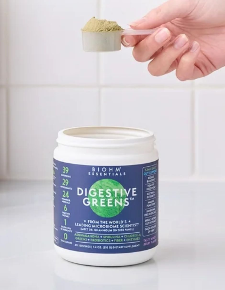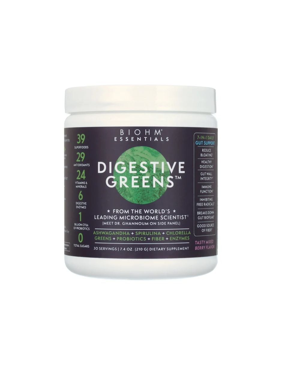 El producto contiene 39 superalimentos, 29 antioxidantes, 24 vitaminas y minerales, 6 enzimas digestivas y mil millones de UFC de probióticos patentados, que trabajan juntos para descomponer las biopelículas digestivas, reducir la hinchazón y mejorar la digestión. El producto también es una buena fuente de fibra, que es esencial para mantener un intestino sano. Los beneficios clave de Digestive Greens incluyen una mejor salud digestiva, reducción de la hinchazón y los gases, mayor energía y un mejor bienestar general.