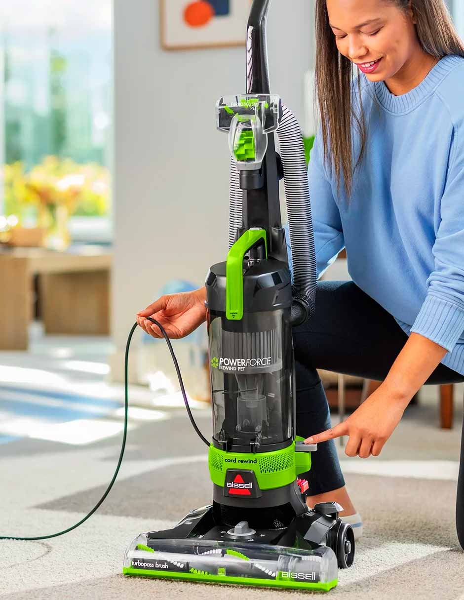 La aspiradora vertical para mascotas PowerForce Helix Turbo Rewind de BISSELL cuenta con nuestro exclusivo sistema de separación de suciedad Helix™ Performance para ayudar a mantener la suciedad fuera de los filtros y lograr un rendimiento de recolección más duradero. También cuenta con un camino de limpieza extra ancho para eliminar la suciedad y el pelo incrustados en menos tiempo. La aspiradora para mascotas PowerForce® Turbo Rewind es liviana y fácil de maniobrar, por lo que puede subirla y bajarla por las escaleras y aspirar debajo de los muebles. El mantenimiento de la máquina es fácil con el tanque de suciedad Easy Empty™ de gran capacidad que vacía la suciedad y los residuos con solo presionar un botón.