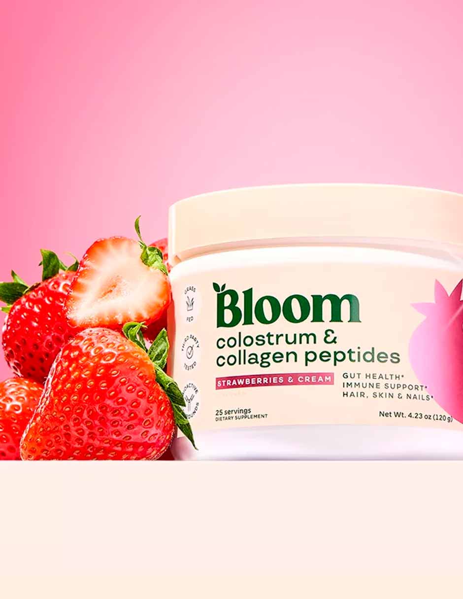 Bloom Nutrition Mezcla de calostro bovino con péptidos de colágeno sabor Fresa con crema 120gr