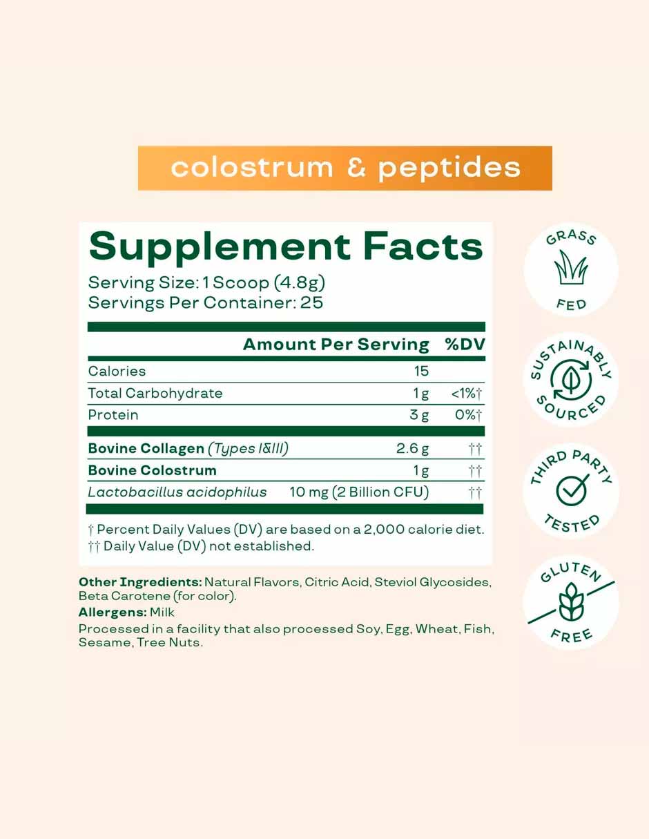 Bloom Nutrition Mezcla de calostro bovino con péptidos de colágeno sabor naranja con crema 120g
