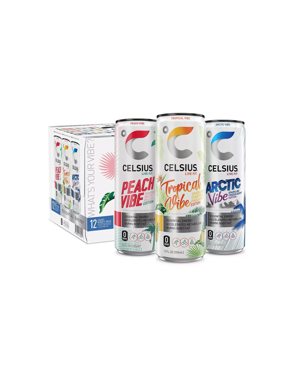 CELSIUS VIBE Bebida Energética paquete variado 12 latas Peach, Tropical & Arctic Vibe