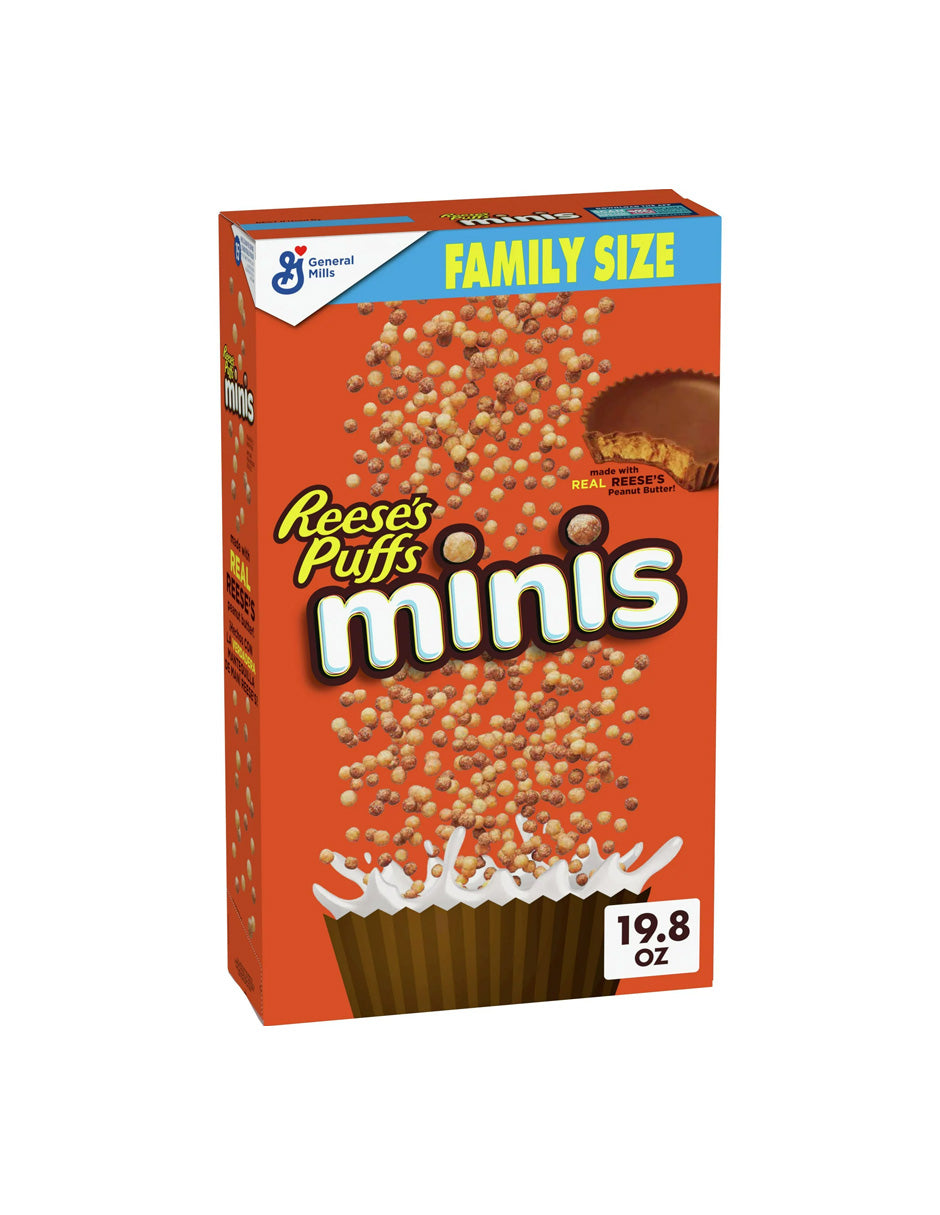 - Contiene una caja de tamaño familiar de 19.8 oz de General Mills Reese's Puffs Minis Chocolate Peanut Butter Breakfast Cereal