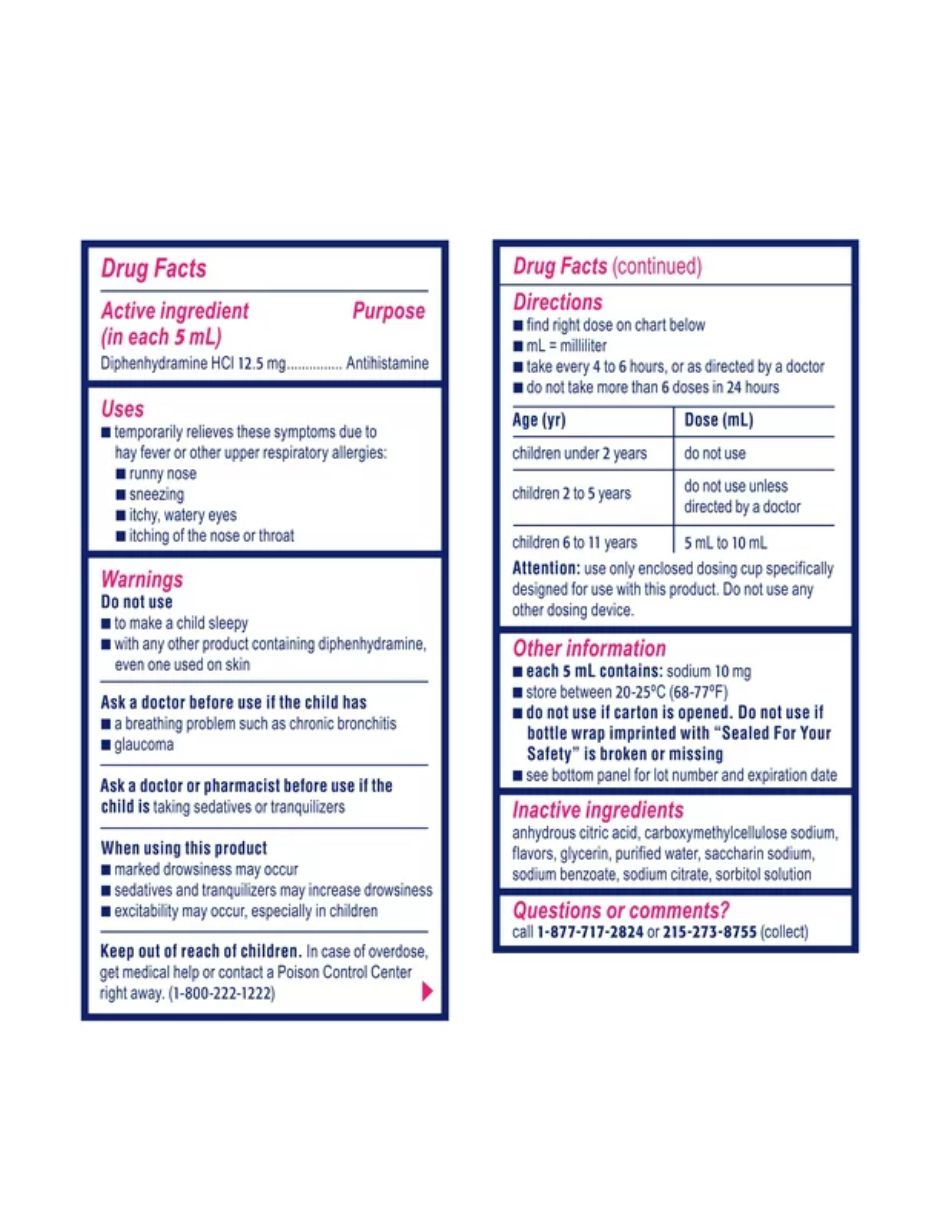 - Contiene 12,5 mg de difenhidramina HCl por dosis para aliviar los síntomas de alergia de su hijo