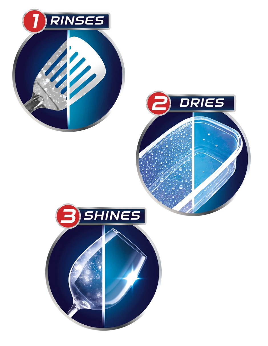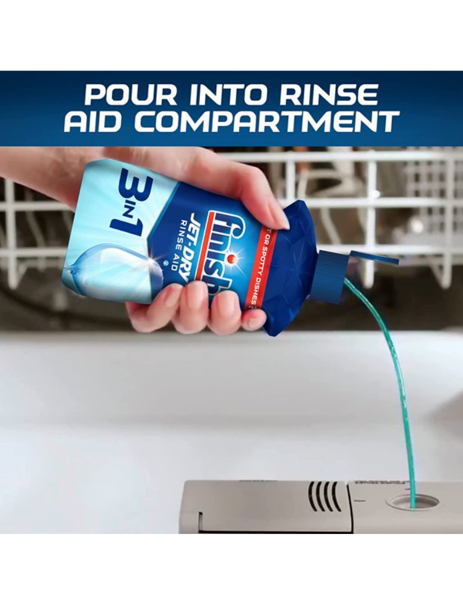 - Llene el dispensador de agente de enjuague en la puerta de su lavavajillas con Finish Jet-Dry Refill mensualmente para obtener los mejores resultados
