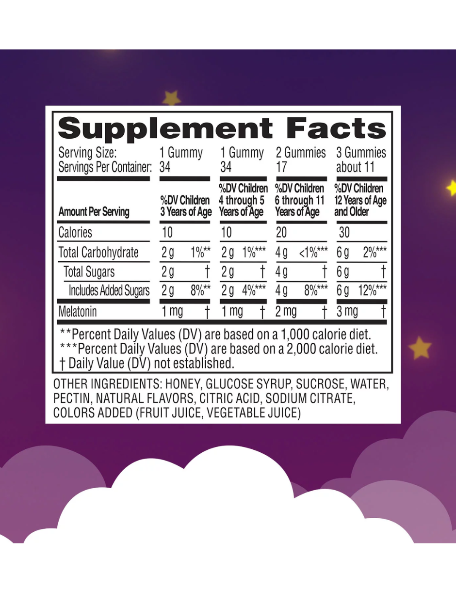 - Cada gominola deliciosa tiene 1 mg de melatonina para ayudar a promover un sueño reparador* en niños a partir de 3 años
