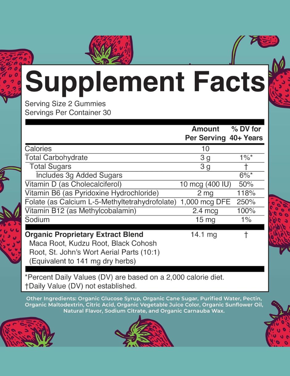 Gomitas orgánicas diseñadas para complementar la rutina diaria durante la etapa de menopausia. Su fórmula incluye ingredientes de origen vegetal como maca, kudzu y cohosh negro, junto con vitaminas del complejo B y vitamina D.