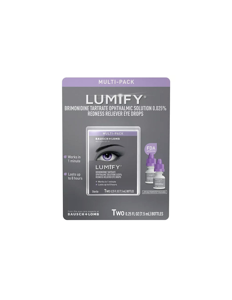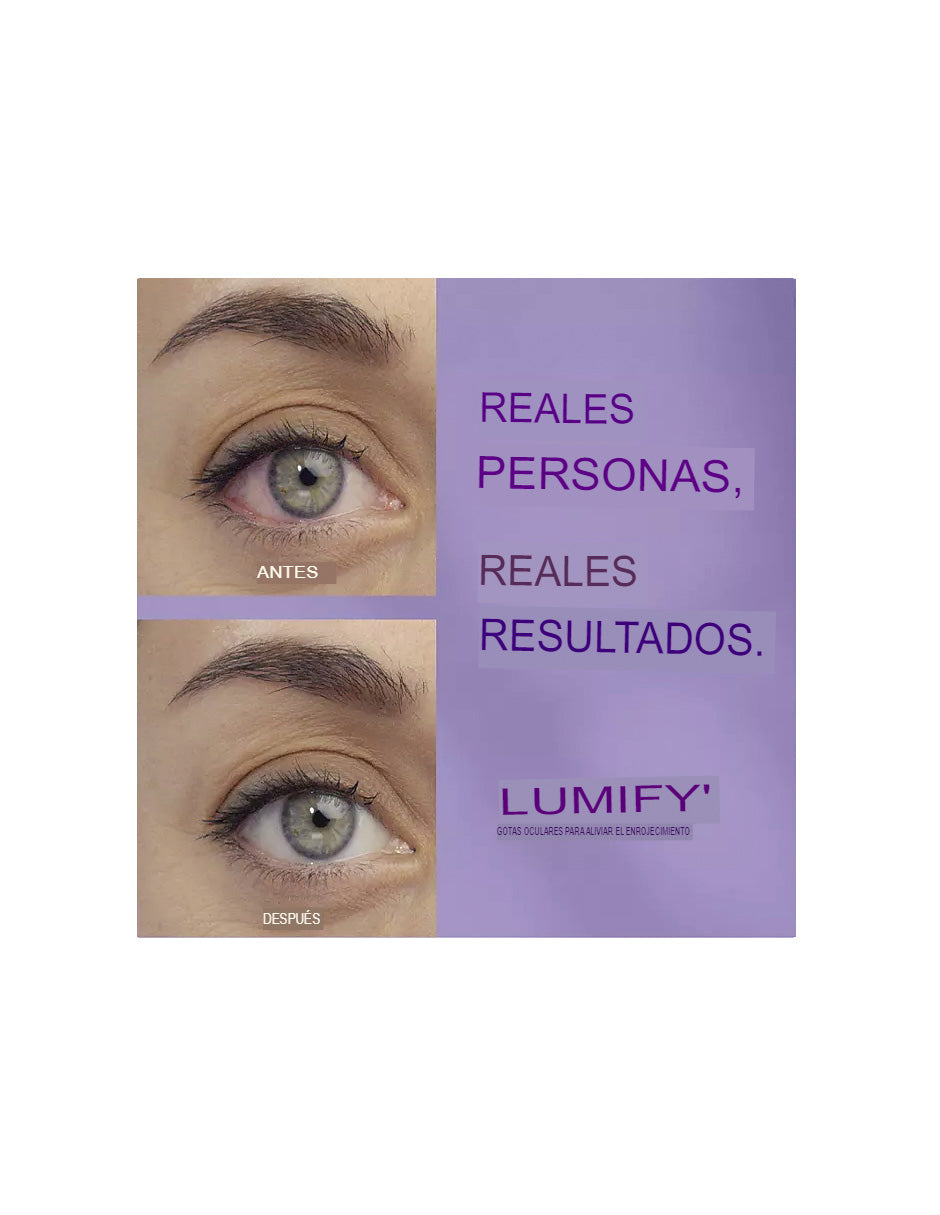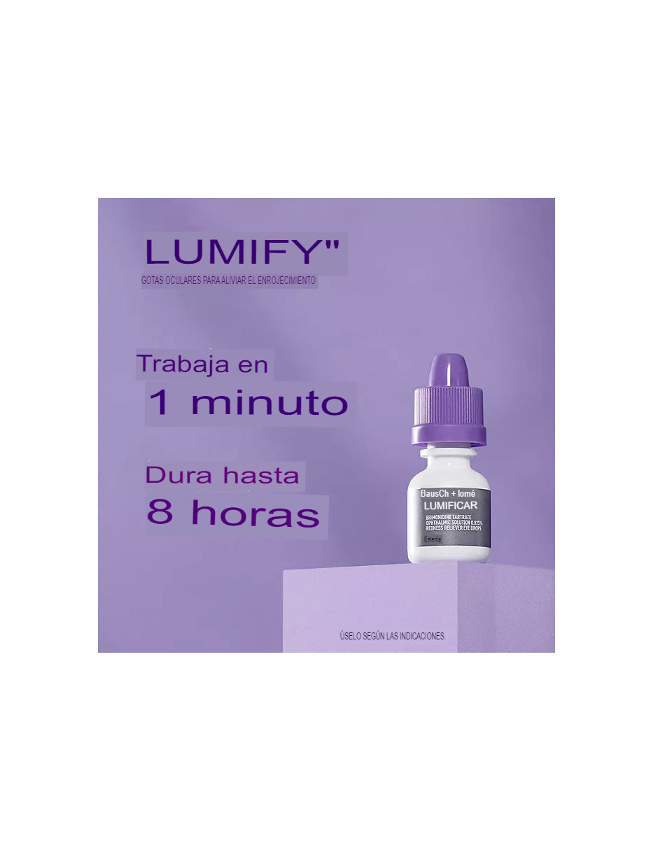 Logra una mirada más fresca y luminosa con las gotas para ojos LUMIFY. Su fórmula única con brimonidina ayuda a reducir el enrojecimiento desde el primer minuto y ofrece resultados que duran hasta 8 horas. No contiene lejía ni colorantes, y ha sido clínicamente probada para un uso seguro cuando se sigue según indicaciones. Presentación de 7.5 ml, ideal para llevar contigo y usar cuando lo necesites.