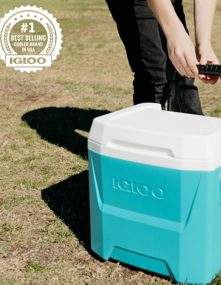 Hielera portátil con ruedas diseñada para transportar bebidas y alimentos de forma práctica durante viajes, paseos o actividades al aire libre. Su diseño compacto permite llevarla fácilmente en automóvil o utilizarla para excursiones, días de campo o almuerzos fuera de casa.