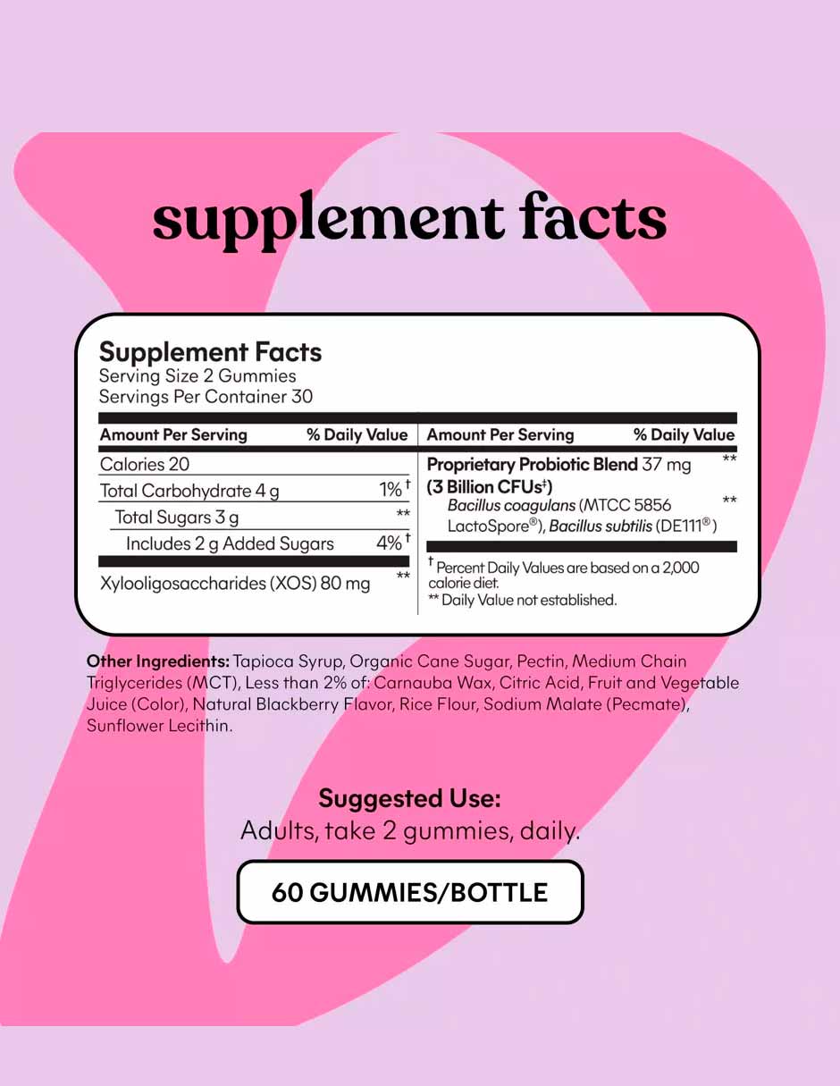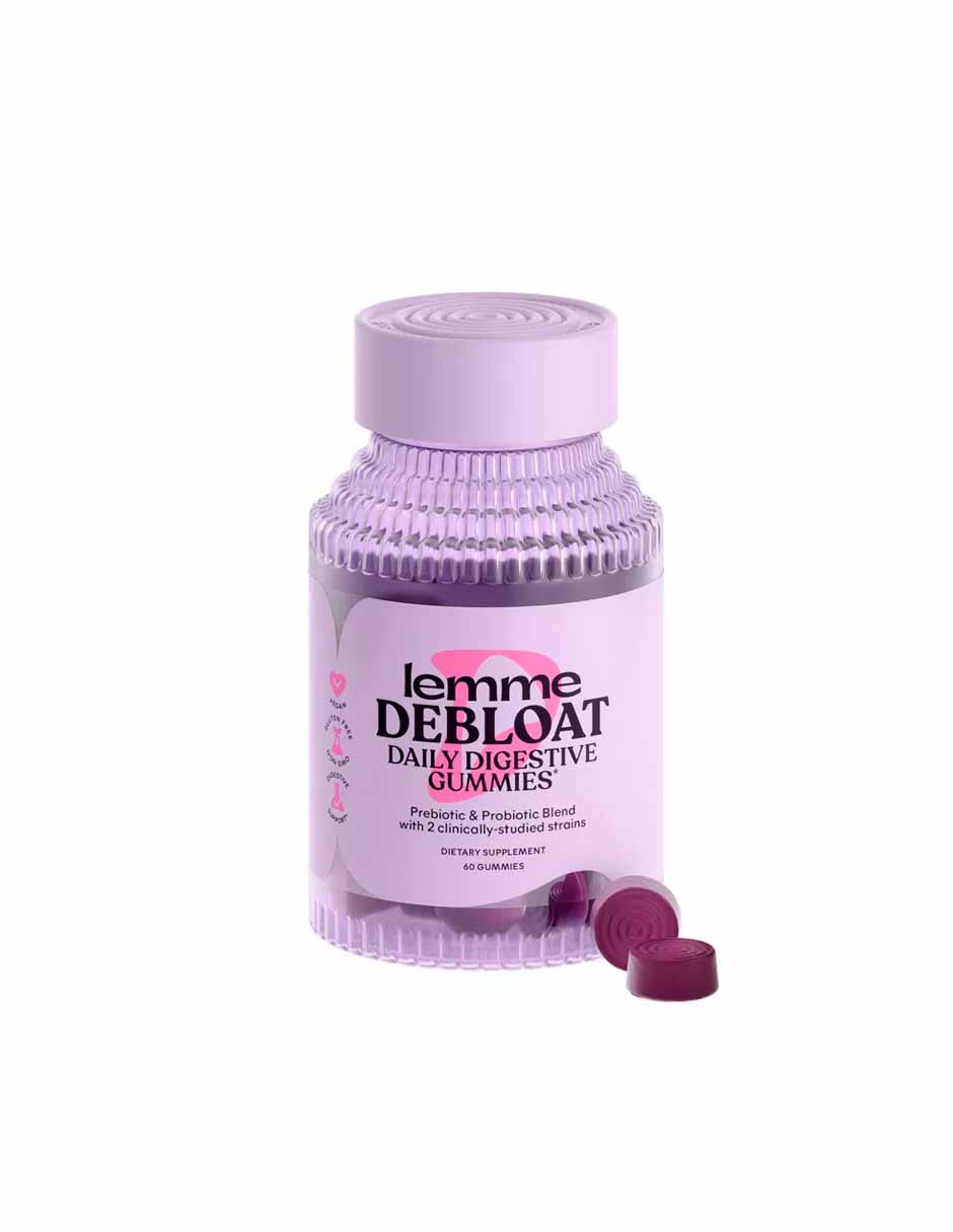 Las gomitas digestivas diarias Lemme Debloat apoyan el alivio de la hinchazón con dos probióticos clínicamente estudiados y un prebiótico que ha demostrado reducir la hinchazón, ayudar a la digestión, reducir los gases ocasionales, alimentar un intestino sano y respaldar su sistema inmunológico. Estas deliciosas gomitas con sabor a mora están formuladas con dos cepas de probióticos clínicamente estudiados (LactoSpore y DE111) probados para sobrevivir al ambiente ácido y severo del estómago y llegar al tracto digestivo, donde son más efectivos. Formulado para uso diario.