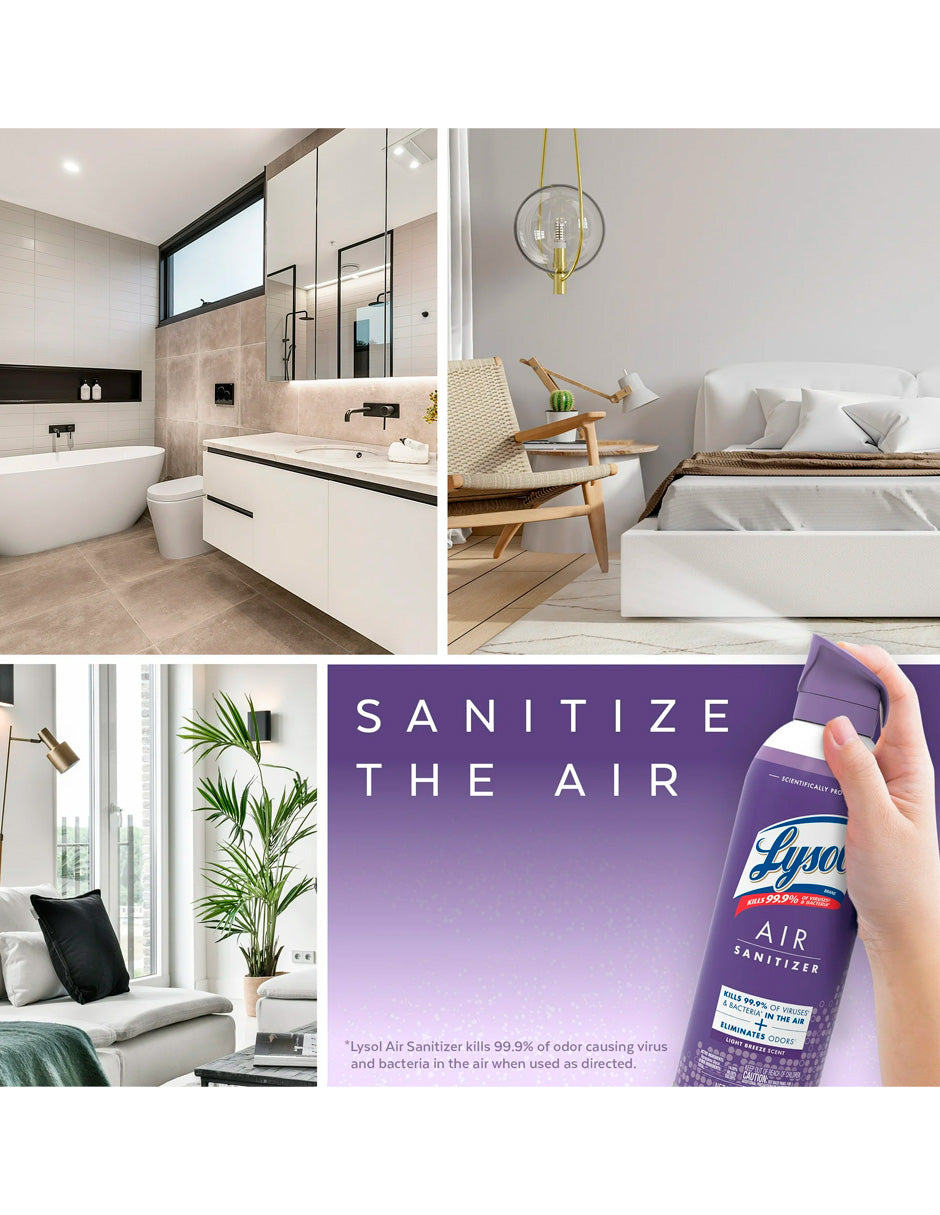 - AYUDE A PROTEGER CONTRA PATÓGENOS EN EL AIRE: Agregue Lysol Air Sanitizing Spray a su rutina de limpieza para eliminar el 99.9% de los virus y bacterias* en el aire y ayudar a proteger a su familia. (*Utilizar como se indica).