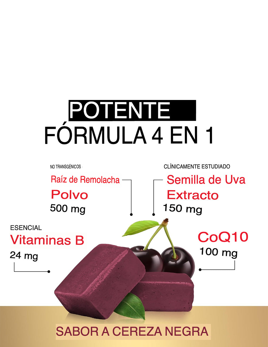 Suplemento con CoQ10, remolacha y semilla de uva para mejorar circulación, presión y energía. Sabor afrutado y fácil de tomar en cualquier momento.