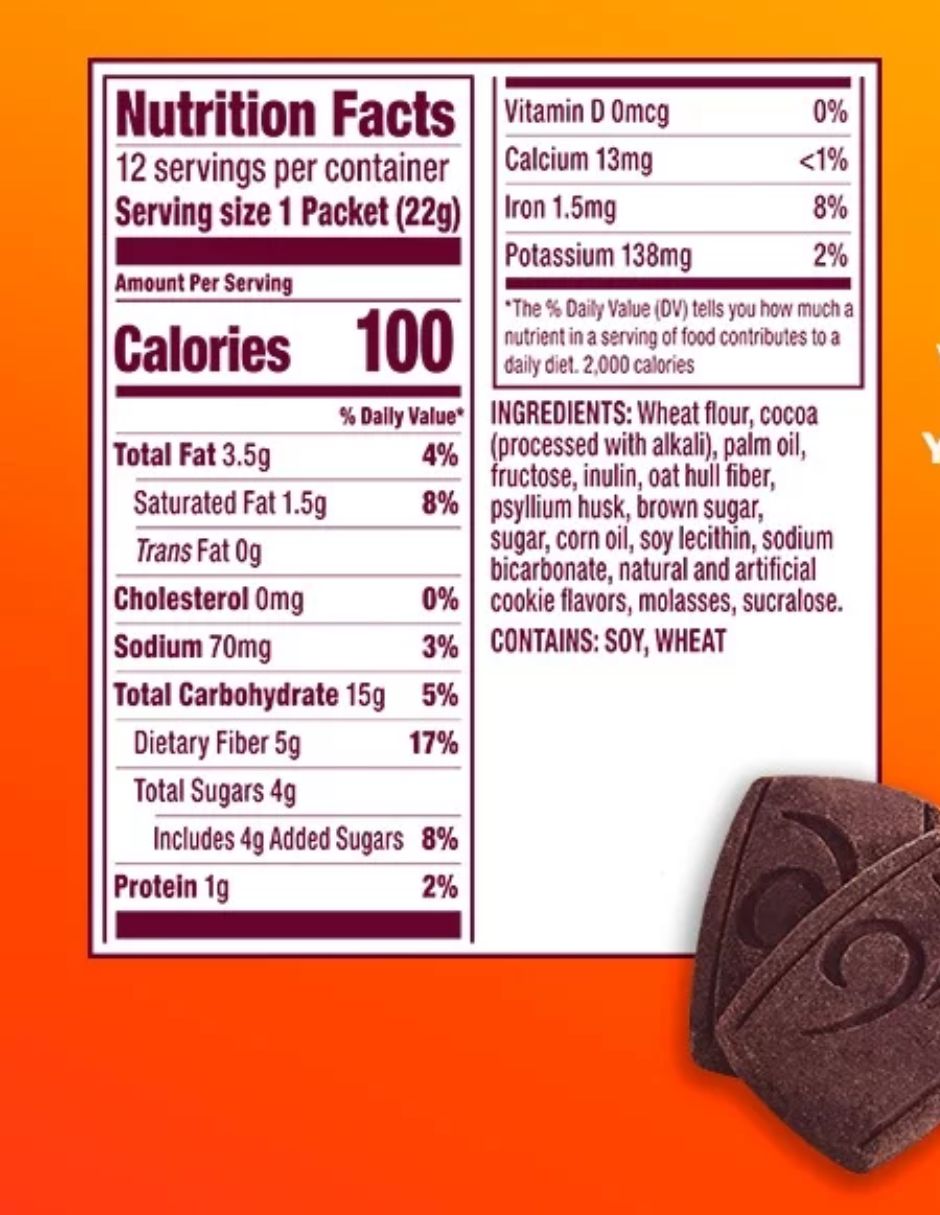 Harina de trigo, cacao (procesado con álcali), aceite de palma, fructosa, inulina, fibra de cáscara de avena, cáscara de psyllium, azúcar morena, azúcar, aceite de maíz, lecitina de soja, bicarbonato de sodio, sabores naturales y artificiales para galletas, melaza, sucralosa