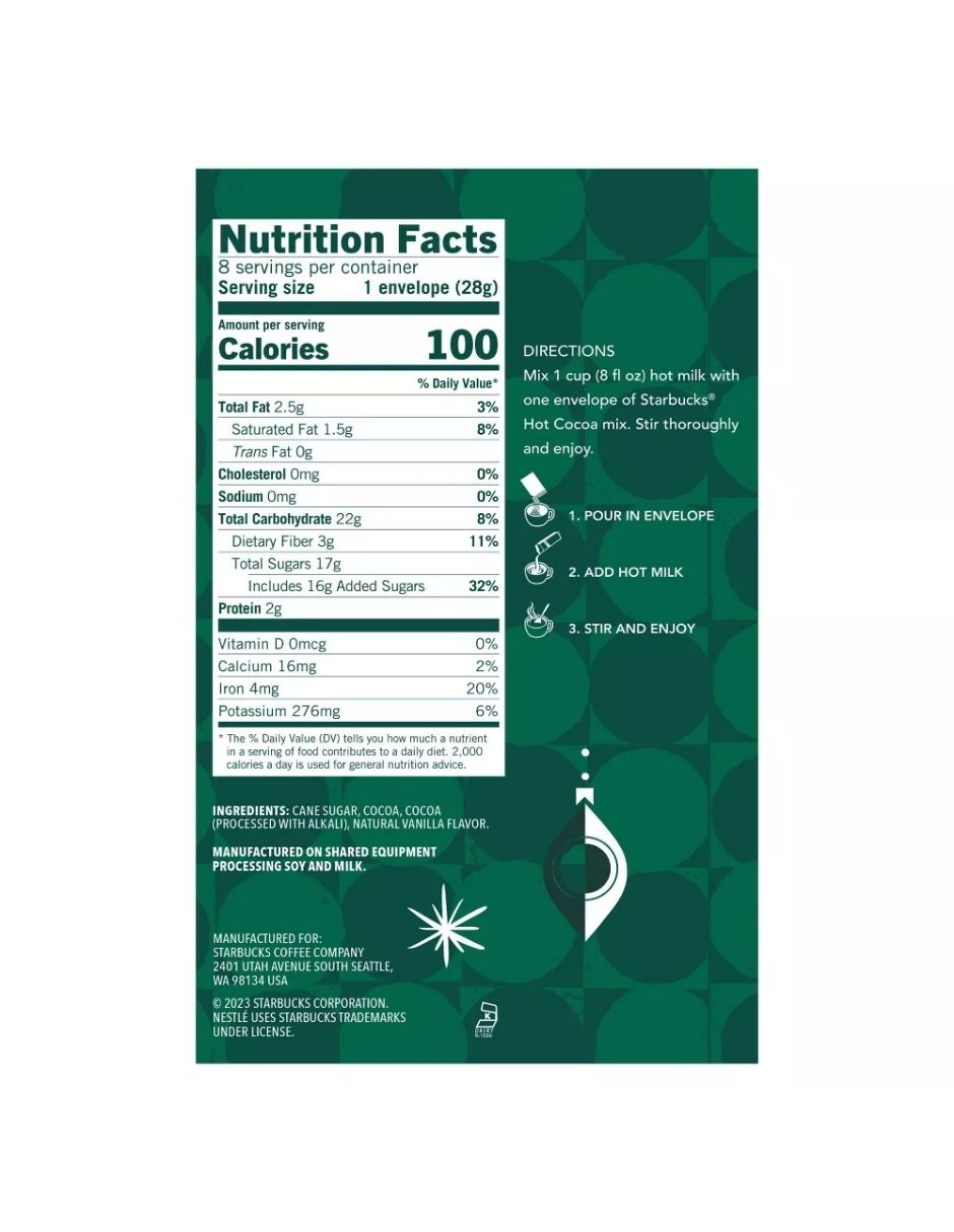 Esta mezcla para chocolate caliente clásico de Starbucks combina cacao de origen sostenible con azúcar de caña y un toque de sabor natural a vainilla.