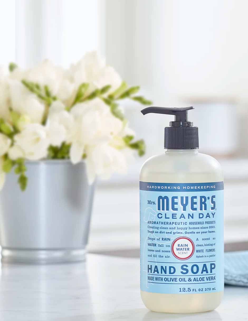 Los jabones para manos Mrs. Meyer's Clean Day están hechos específicamente para limpiar y refrescar las manos sin secarlas demasiado, al tiempo que brindan un aroma especial y singular para su hogar. Las gotas de agua de lluvia caen sobre las hojas y las narices y llenan el aire. Nuestro jabón perfumado Rain Water tiene un aroma muy limpio, con un toque de flores blancas. ¡Salpique en un charco! Esta fórmula de jabón para manos trabajadora contiene aceite de oliva, aloe vera y aceites esenciales, e ingredientes cuidadosamente seleccionados que limpian y refrescan las manos. Elaborado sin parabenos, ftalatos ni ingredientes derivados de animales y siempre con una fórmula de jabón libre de crueldad animal. También disponible en otras fragancias y productos inspirados en el jardín, como Dish Soap y Multi-Surface Cleaner. Mrs. Meyer's – Arraigado en la bondad.
