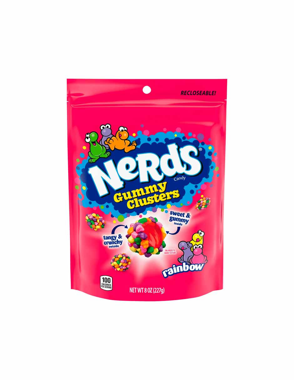 Los Nerds Gummy Clusters son una combinación de sabores y texturas, saborizantes, crujientes, dulces, gomosos y la capacidad de podar del tamaño de un bocado. Rainbow Nerds rodean los centros afrutados y gomosos. Esas pequeñas chispas dulces son inventores fantásticos. Un grupo poppable, lleno de nerds picantes y crujientes. Un dulce tan sabroso que ni siquiera hay palabras. Pruebe la creación crujiente, gomosa y deliciosa: el dulce divertido y divertido de comer con una variedad de opciones deliciosas, crujientes, masticables y gomosas: Original que incluye la icónica caja de doble sabor, Ropes, Big Chewy y ahora Gummy Clusters. La caja icónica original combina dos sabores complementarios con cámaras dobles, lo que permite a los amantes de los dulces derramar piezas perfectamente imperfectas de puro deleite. Las cuerdas les dan a los fanáticos una cuerda masticable y afrutada llena de crujientes, dulces,