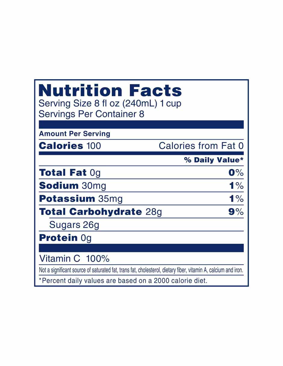 Agua filtrada, azúcar de caña o remolacha, jugo de uva (agua, concentrado de jugo de uva), jugo de arándano (agua, concentrado de jugo de arándano), jugo de granada (agua, concentrado de jugo de granada), aromas naturales, ácido fumárico, ácido málico, ácido ascórbico ( Vitamina C), Citrato de Sodio.