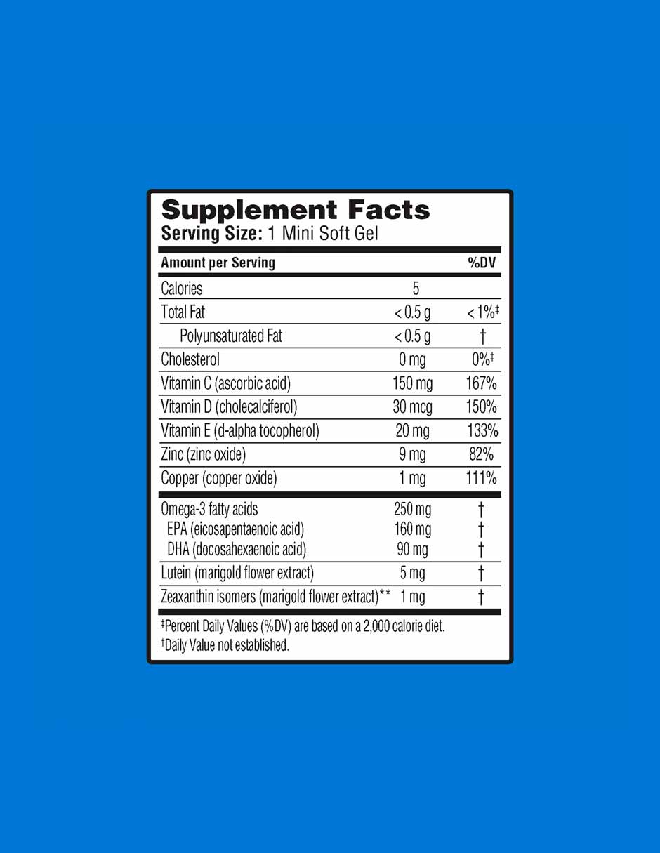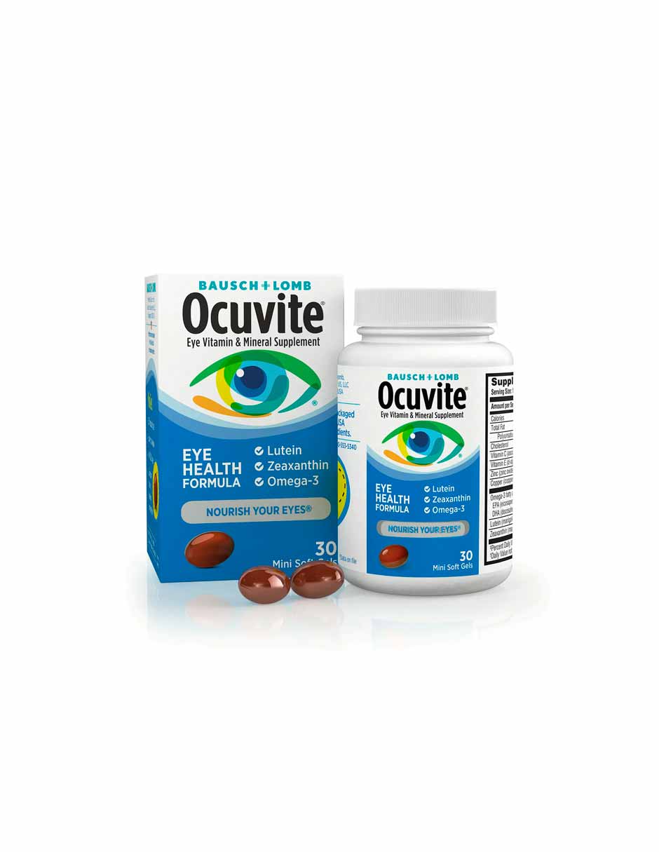 - VITAMINAS PARA LOS OJOS DE LA FÓRMULA DE SALUD DE LOS OJOS DE OCUVITE: este suplemento para los ojos de Bausch + Lomb contiene luteína y zeaxantina combinadas para la salud de los ojos, así como nutrientes que son importantes para la salud de los ojos, incluyendo vitamina C y E, omega-3, zinc y cobre. Nutrición ocular para hoy.