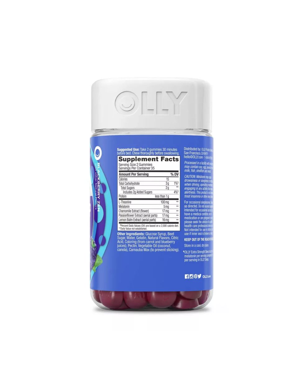 Las gomitas para dormir OLLY para adultos ofrecen una mezcla única de ingredientes activos que trabajan juntos para calmar tu mente y promover un sueño reparador para que te despiertes sintiéndote renovado. Estas gomitas de melatonina, con L-teanina y productos botánicos como la manzanilla y el bálsamo de limón, trabajan con su cuerpo para ayudarlo a conciliar el sueño y permanecer dormido.* El sueño es vital para mantener la salud en general, por lo que es importante obtener su ZZZ. El suplemento gomoso OLLY Extra Strength Sleep para hombres y mujeres ayuda a relajar la mente y calmar los sentidos para que pueda conciliar el sueño rápido, permanecer dormido y despertar sintiéndose renovado.* -ingredientes formadores: melatonina para un sueño suave y L-teanina, manzanilla y bálsamo de limón para ayudar a calmar y relajar.*
