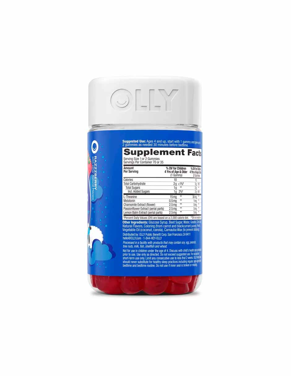 L-teanina, melatonina, extracto de manzanilla (flor), extracto de pasiflora, extracto de toronjil, jarabe de glucosa, azúcar de remolacha, agua, gelatina, ácido cítrico, aromas naturales, colorante (de jugos de zanahoria y grosella negra), pectina, aceite vegetal (coco , canola), cera de carnauba (para evitar que se pegue)