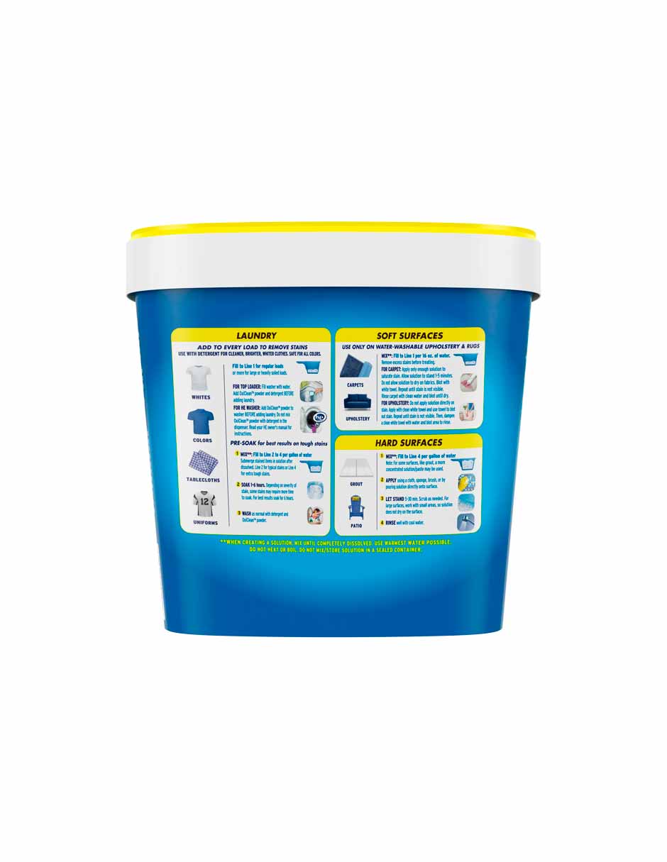 - Combate las manchas difíciles: el polvo OxiClean cuenta con una fórmula a base de oxígeno activada por agua que elimina la suciedad resistente, las manchas persistentes y las manchas fijas.