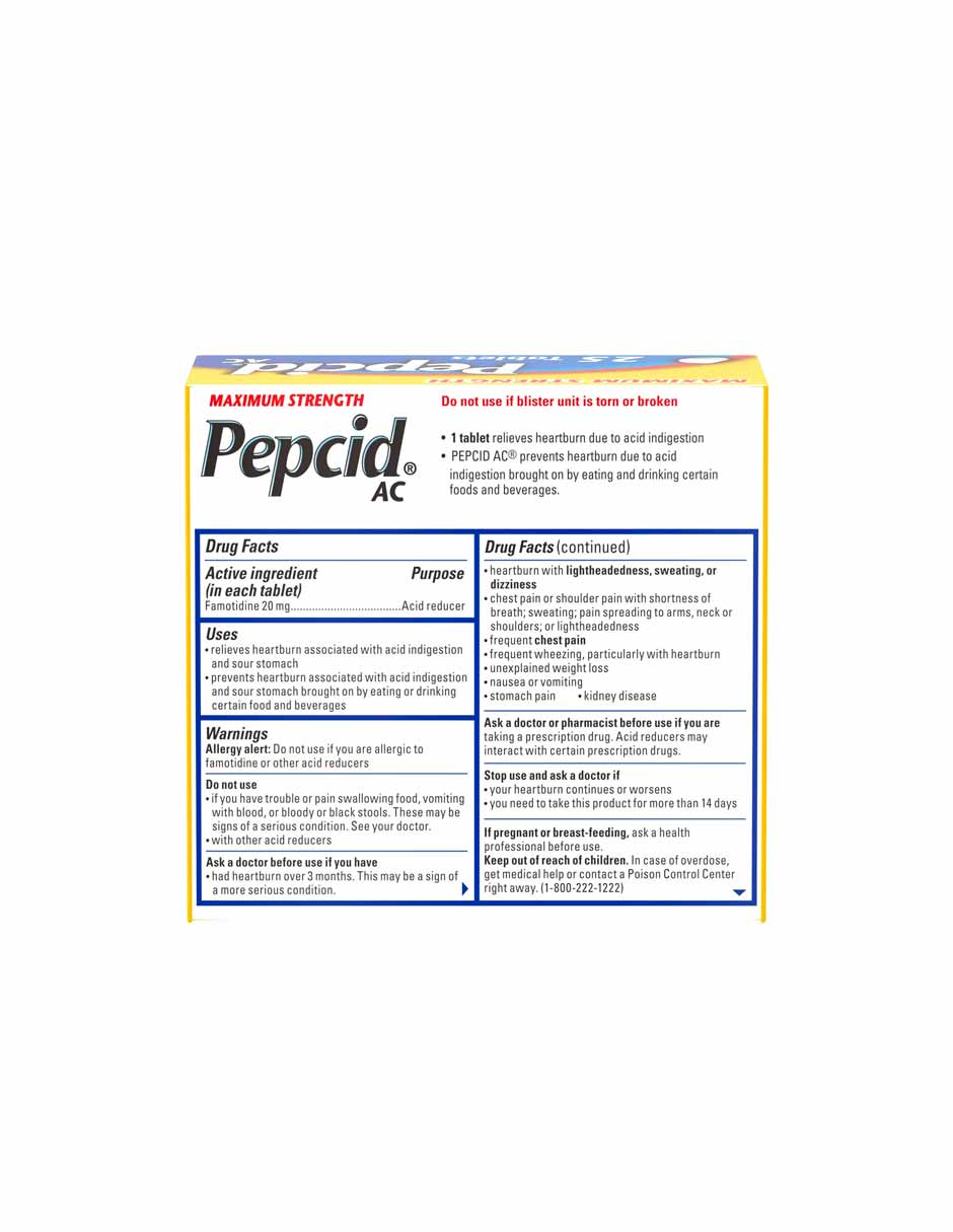 - Las tabletas para el alivio de la acidez estomacal de Maximum Strength Pepcid AC con famotidina ayudan a prevenir y aliviar la acidez estomacal