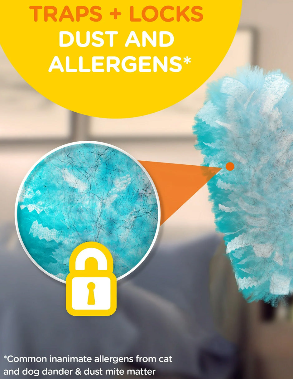 Swiffer Dusters TRAP + LOCK polvo y alérgenos *. Fabricado con fibras especialmente recubiertas que se adhieren al polvo y no lo sueltan. Están diseñados exclusivamente para atrapar y bloquear el polvo incluso en los espacios reducidos de su hogar. * alérgenos inanimados comunes de la caspa de perros y gatos y la materia de los ácaros del polvo