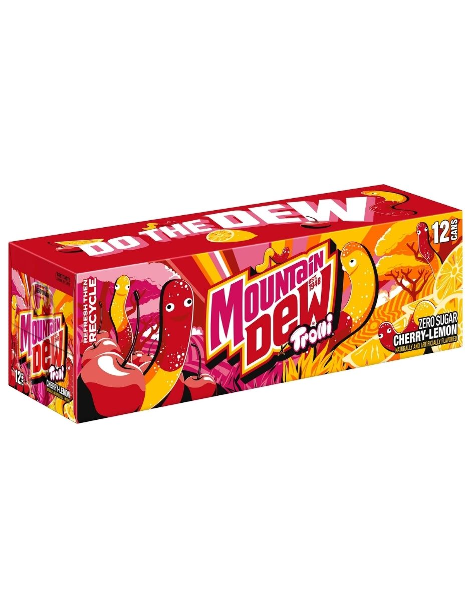 Disfruta la energía refrescante del Refresco Sin Azúcar Mountain Dew Cereza Limón Trolli.Cada lata de 12 fl oz combina el toque cítrico del limón con la intensidad dulce y ácida de la cereza, inspirado en los sabores de Trolli Cherry Lemon Sour Brite Crawlers.