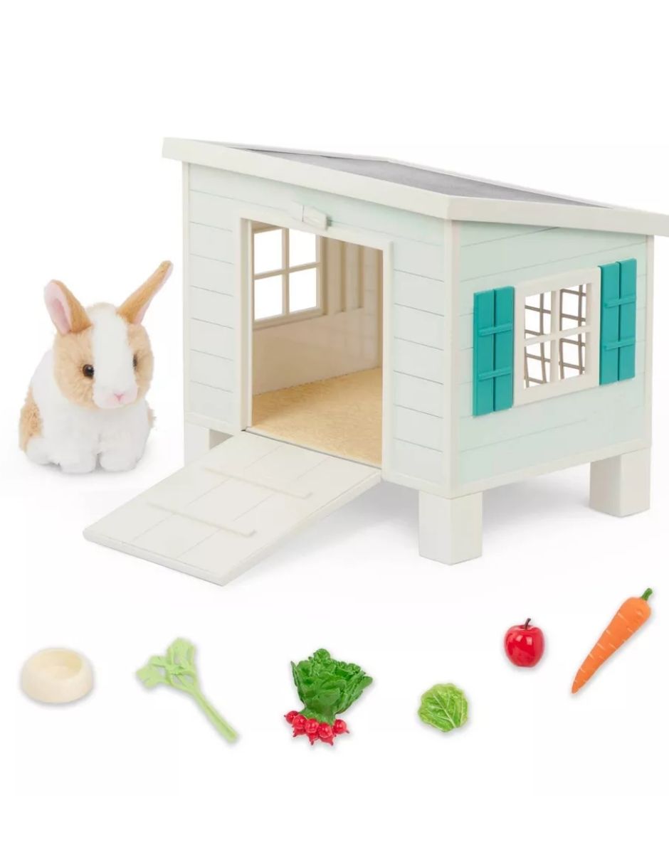 Set de Accesorios para Conejitas con Conejo de Peluche Our Generation está diseñado para complementar las actividades de juego ofreciendo un espacio temático inspirado en una conejera. El diseño incluye colores suaves, ventanas laterales y una puerta frontal que se abre y se cierra, lo que permite recrear diferentes escenarios de interacción con la mascota de juguete.