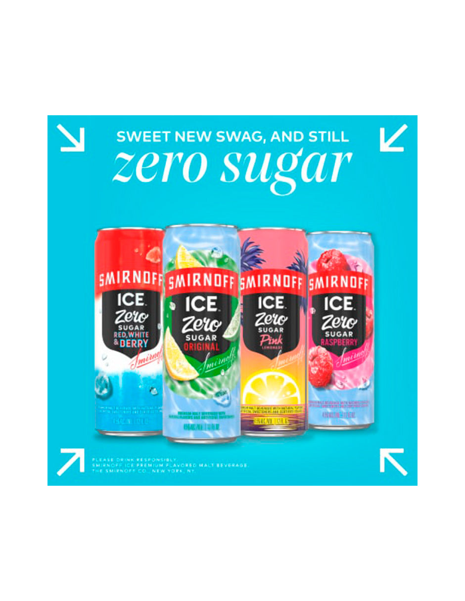 Con Smirnoff Ice Original Zero Sugar, ahora puedes disfrutar del 100% del sabor original sin azúcar. Los sabores de esta colección incluyen Original, Frambuesa, Rojo-Blanco y Baya y Limonada Rosa.
