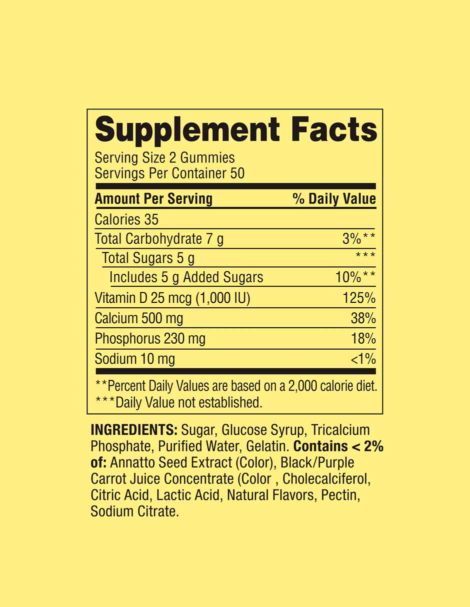 500 mg de calcio y 25 mcg (1000 UI) de vitamina D por porción de 2 gomitas