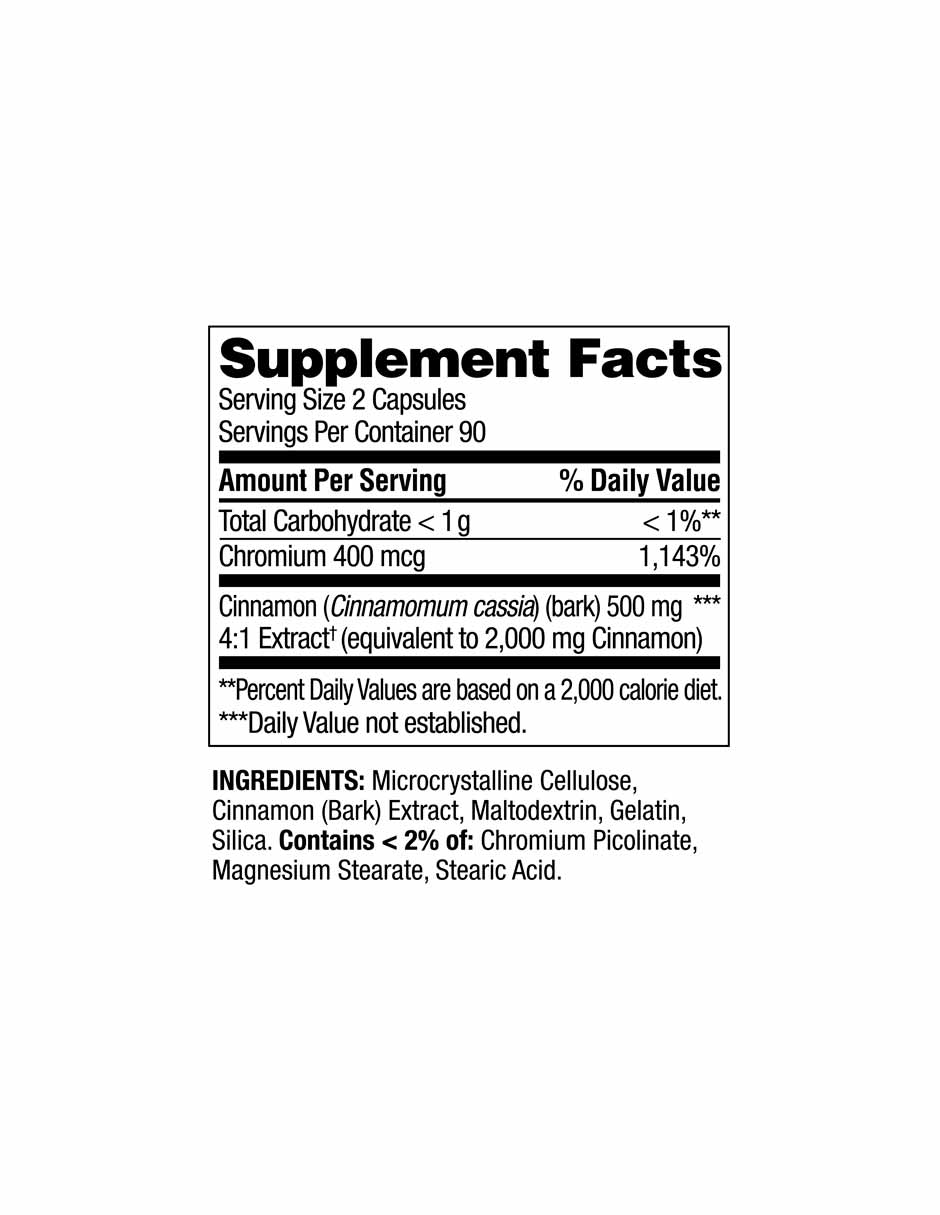 Celulosa microcristalina, extracto de canela (corteza), maltodextrina, gelatina, sílice. Contiene <2% de: picolinato de cromo, estearato de magnesio, ácido esteárico.