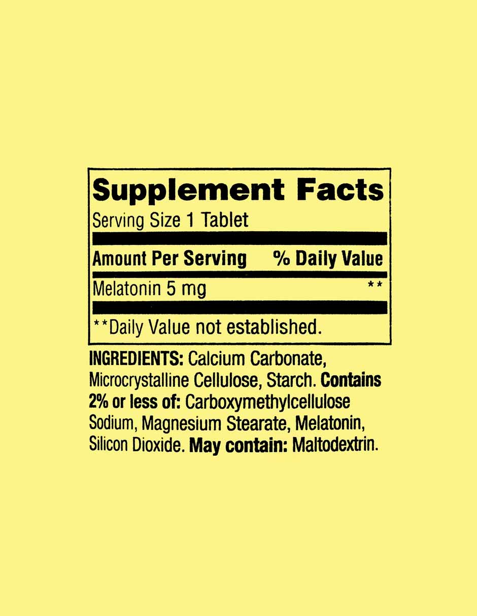 Carbonato de calcio, Celulosa microcristalina, Almidón. Contiene 2% o menos de: carboximetilcelulosa sódica, estearato de magnesio, melatonina, dióxido de silicio. Puede contener: Maltodextrina.