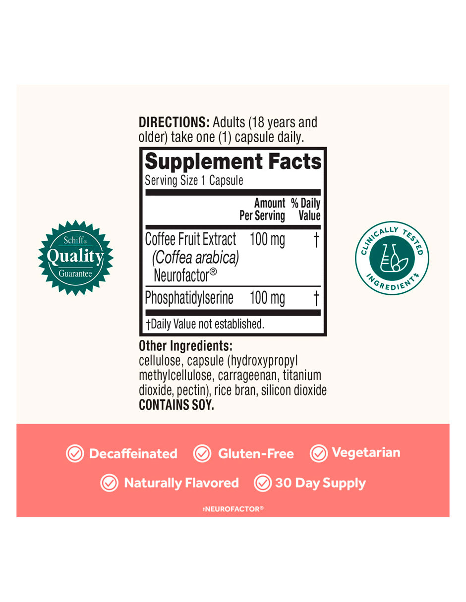 - INGREDIENTES NATURALES CLÍNICAMENTE PROBADOS: Los estudios clínicos han demostrado que la cereza de café (neurofactor) y la fosfatidilserina de origen vegetal tienen un efecto positivo en la salud del cerebro.
