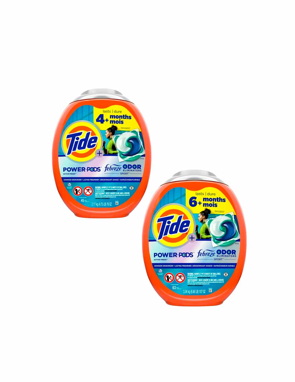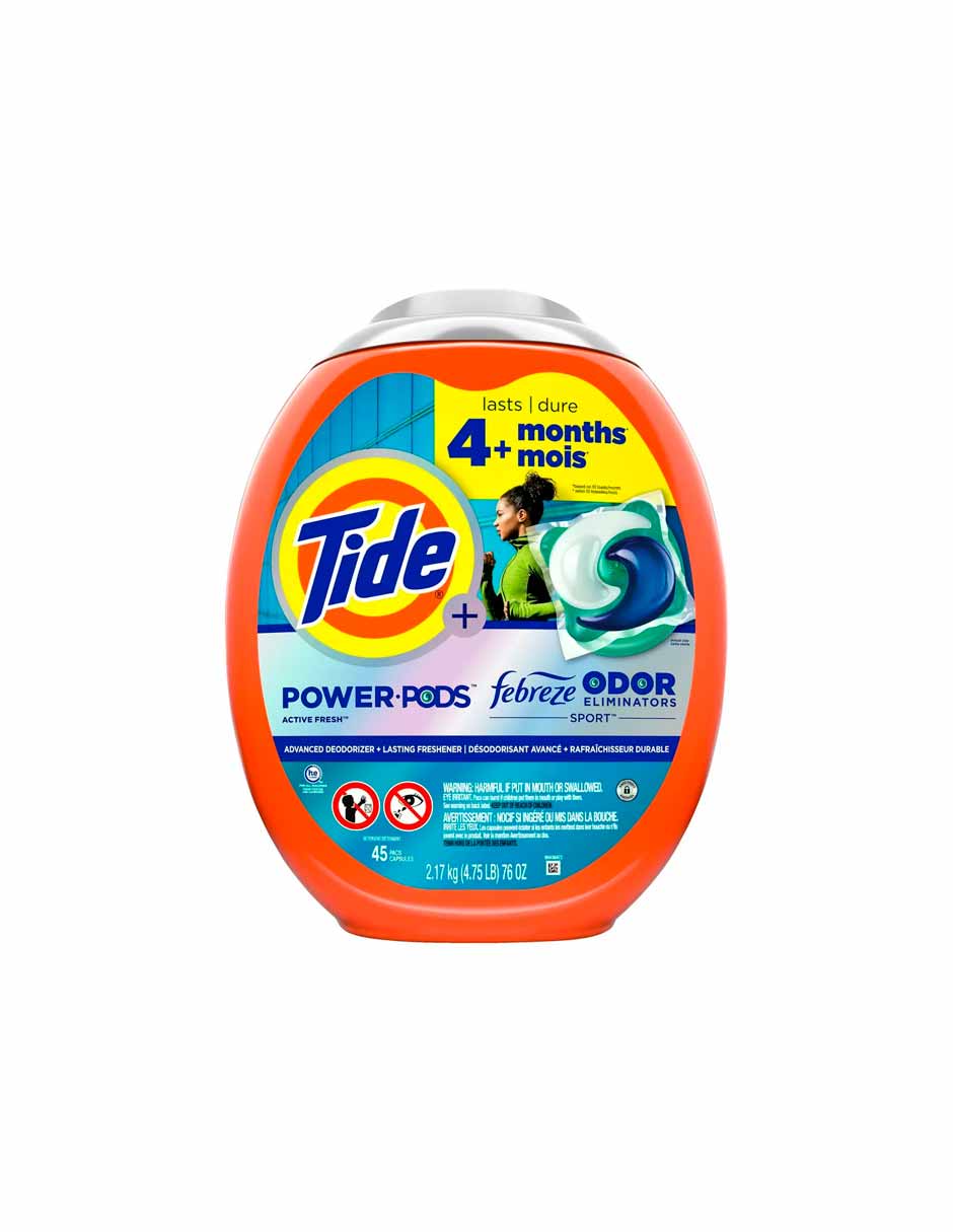 Tide POWER PODS Febreze Odor Eliminators Plus Sport combate las manchas difíciles y los olores persistentes, a la vez que proporciona frescura. Los Tide POWER PODS tienen un 50 % más de poder de limpieza que el detergente líquido Tide y están diseñados para combatir las manchas y los olores en todo tipo de carga y dejar la ropa con un olor fresco. Con tecnología 4 en 1, Tide Plus Febreze ofrece una combinación de detergente concentrado, eliminadores de olores Febreze, quitamanchas y una solución todo en uno de frescura duradera, perfecta para manejar tu apestoso entrenamiento y equipo deportivo. Tide POWER PODS Plus Febreze ayuda a eliminar el mal olor en su origen, mientras deja las prendas con un agradable aroma Active Fresh. Tide POWER PODS funciona en todas las lavadoras y condiciones del agua, especialmente en agua fría. Más que un jabón de lavandería normal, Tide POWER PODS Plus Febreze Sport te brinda la limpieza que esperas de la marca de detergente para ropa número uno más confiable de Estados Unidos*.* Votada como la marca de lavandería más confiable por los compradores estadounidenses según la encuesta de confianza estadounidense BrandSpark de 2022.