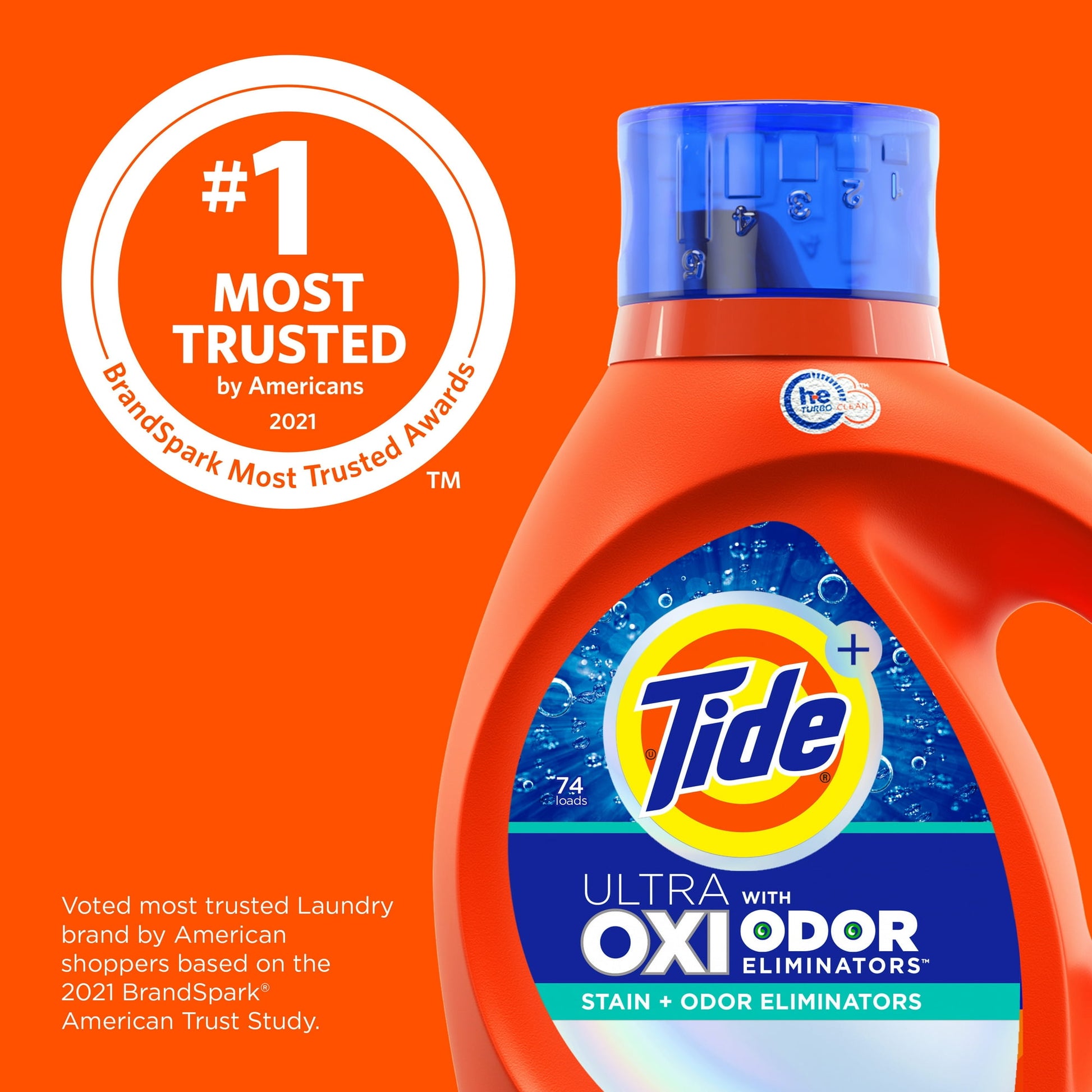 Hay dos cosas que te permiten saber que tu ropa está limpia y fresca: se ve bien y huele bien. Ahora, puedes tener la confianza de ambos beneficios en una sola solución de lavado con el detergente líquido para ropa Tide Ultra Oxi con eliminadores de olores. Es la opción perfecta para familias ocupadas que lavan mucha ropa y quieren resultados en los que puedan confiar en todo momento. No importa cuán grandes o sucias sean, el detergente Tide Ultra OXI HE se encarga de las manchas sin necesidad de pretratarlas ni restregarlas, lo que hace que tu vida y tu rutina de lavado sean más fáciles. Obtén el detergente número uno en confianza de Estados Unidos y aborda las manchas imposibles con confianza y poder. 84 fl oz, 59 cargas*Votada como la marca de lavandería más confiable por los compradores estadounidenses según el estudio BrandSpark® American Trust Study de 2021