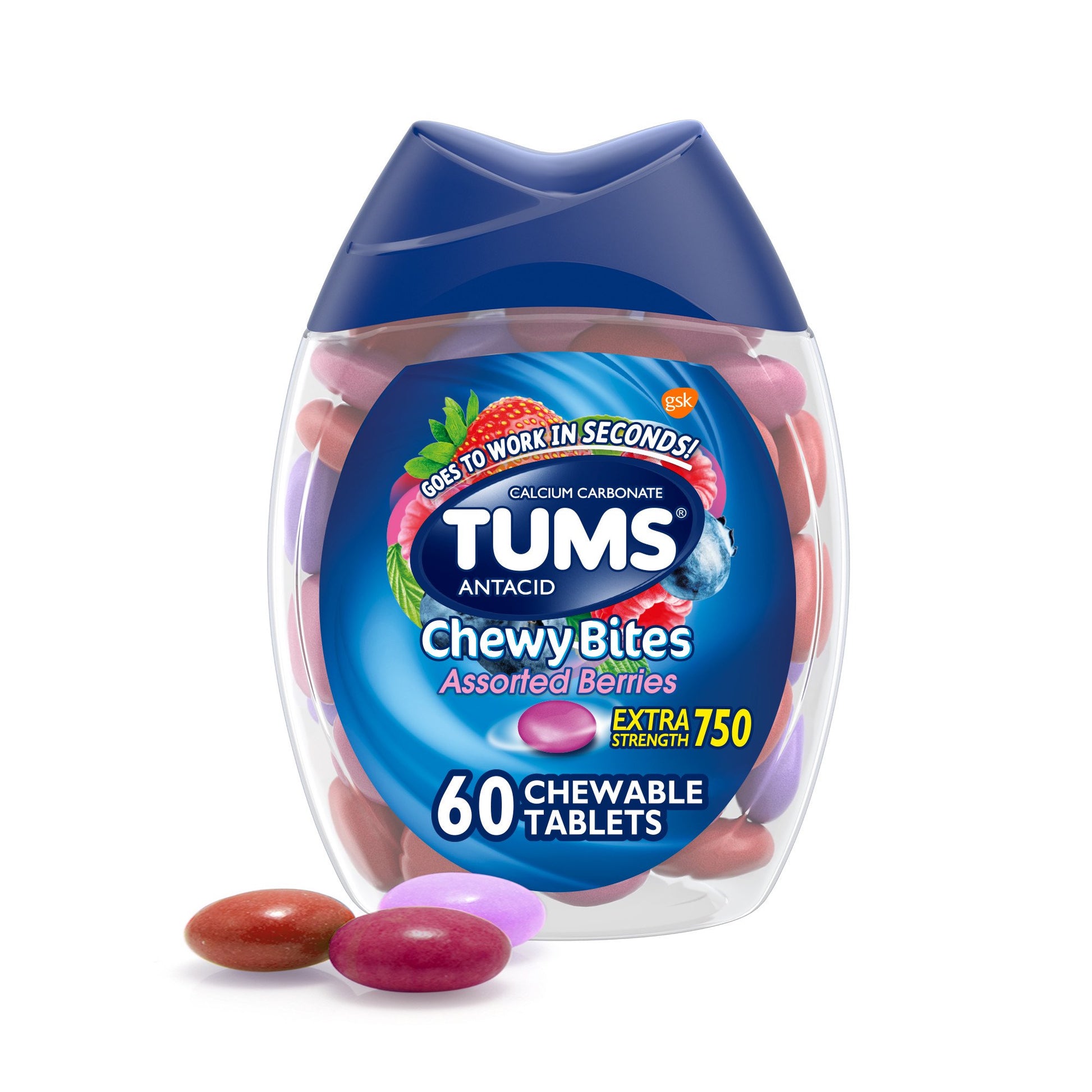 TUMS Chewy Bites ofrece un alivio rápido de la acidez estomacal con cada tableta masticable. Su fórmula con carbonato de calcio actúa en segundos para ayudar a aliviar el malestar causado por acidez o indigestión. Presentación con 60 unidades en sabores frutales variados. Ideal para llevar y usar cuando lo necesites.