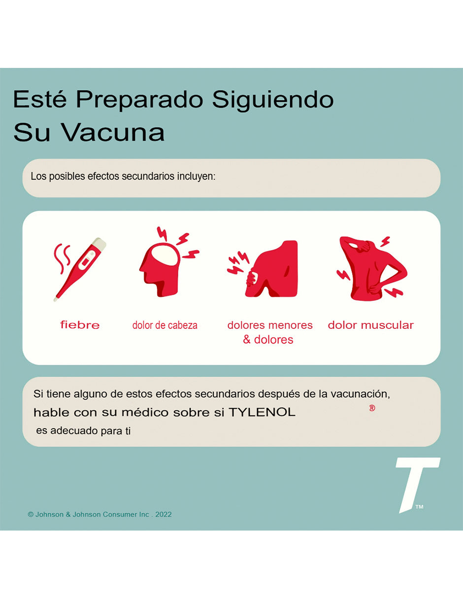 Ingrediente activo (en cada comprimido) Acetaminofeno 650 mg Propósito Analgésico/antifebril Ingredientes inactivos Cera de carnauba, hidroxietilcelulosa, hipromelosa, estearato de magnesio, celulosa microcristalina, almidón modificado, povidona, celulosa en polvo, almidón pregelatinizado, glicolato de almidón sódico, dióxido de titanio, triacetina