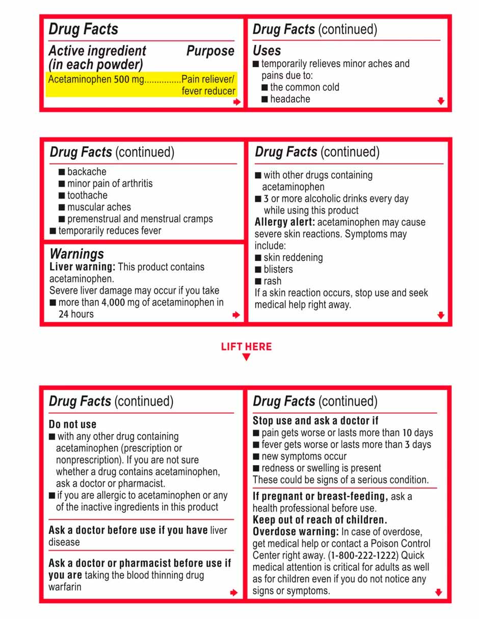 Ingrediente activo (en cada polvo) Acetaminofén 500 mg Propósito Analgésico/reductor de fiebre Ingredientes inactivos Ácido cítrico, etilcelulosa, sabor, estearato de magnesio, maltodextrina, bicarbonato de sodio, sucralosa, xilitol