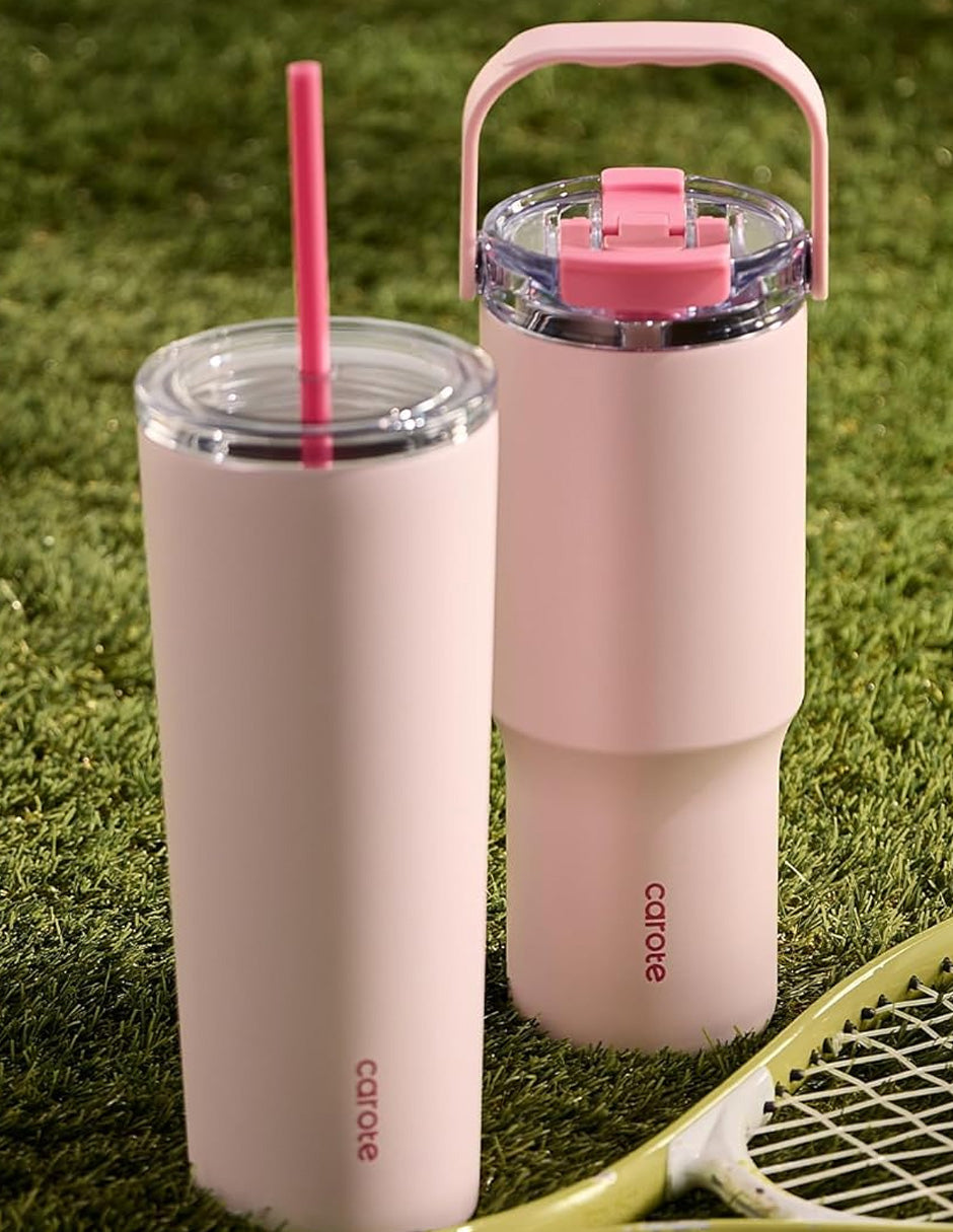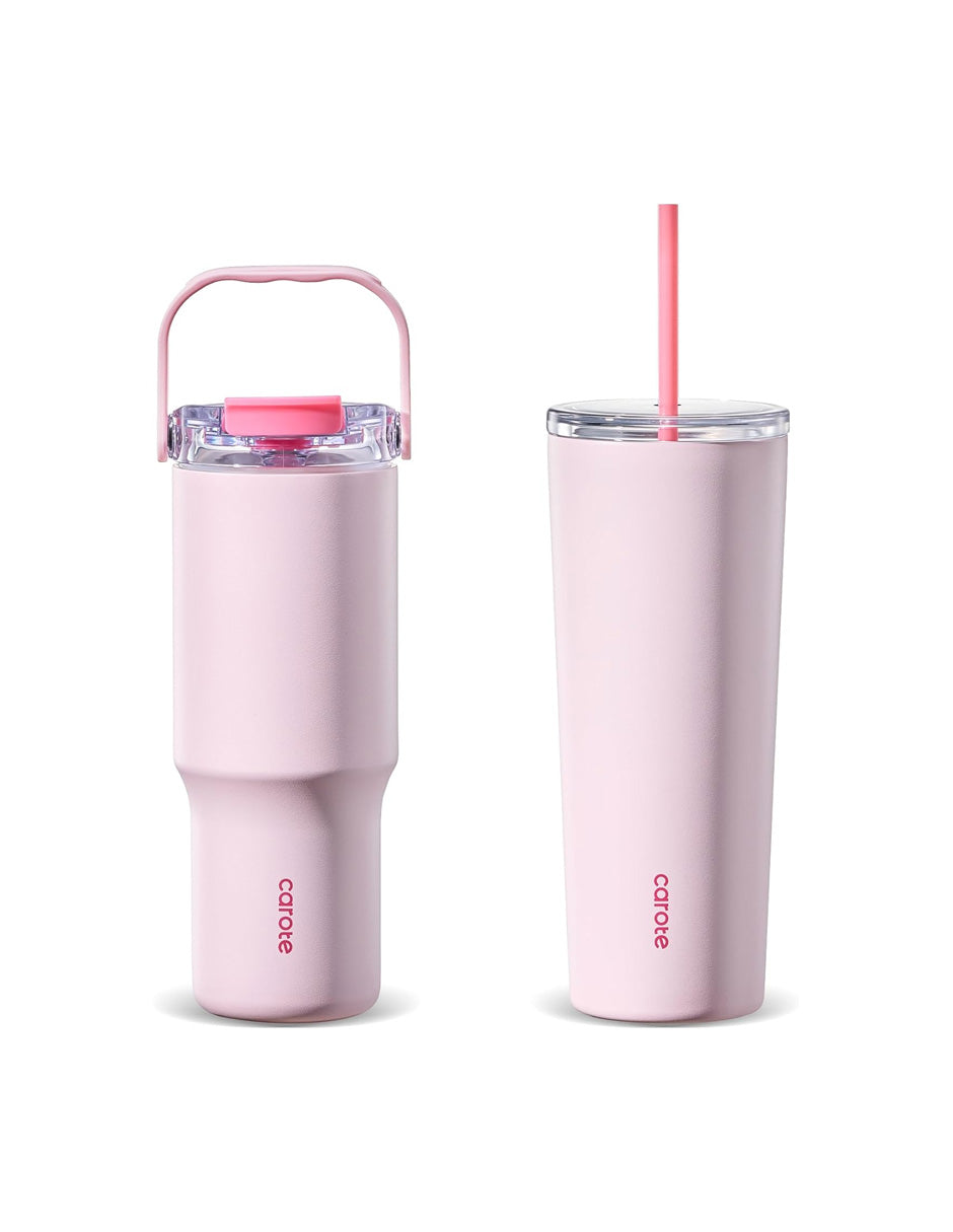 Juego de 2 vasos térmicos reutilizables de acero inoxidable CAROTE: incluye una taza de viaje de 20 onzas con tapa abatible y otra de 30 onzas con tapa y popote. Ideales para café, agua o bebidas frías, mantienen la temperatura por horas gracias a su aislamiento de doble pared. Ambos son a prueba de fugas, libres de BPA y con diseño que se adapta a portavasos de automóvil. Resistentes, fáciles de lavar y perfectos para el uso diario.