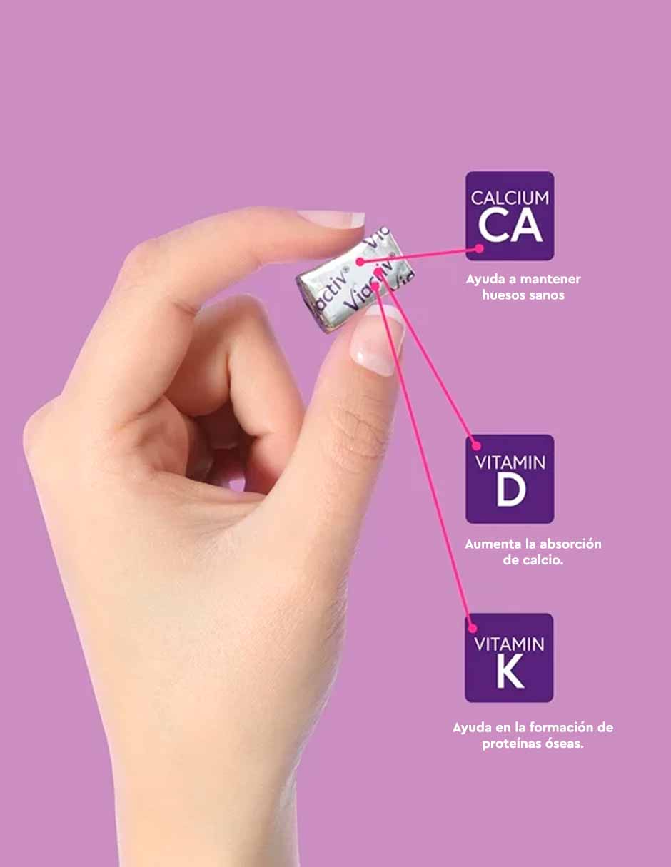 2 masticables = 100 % del valor diario de calcio más vitamina D y K