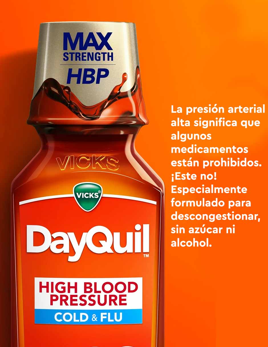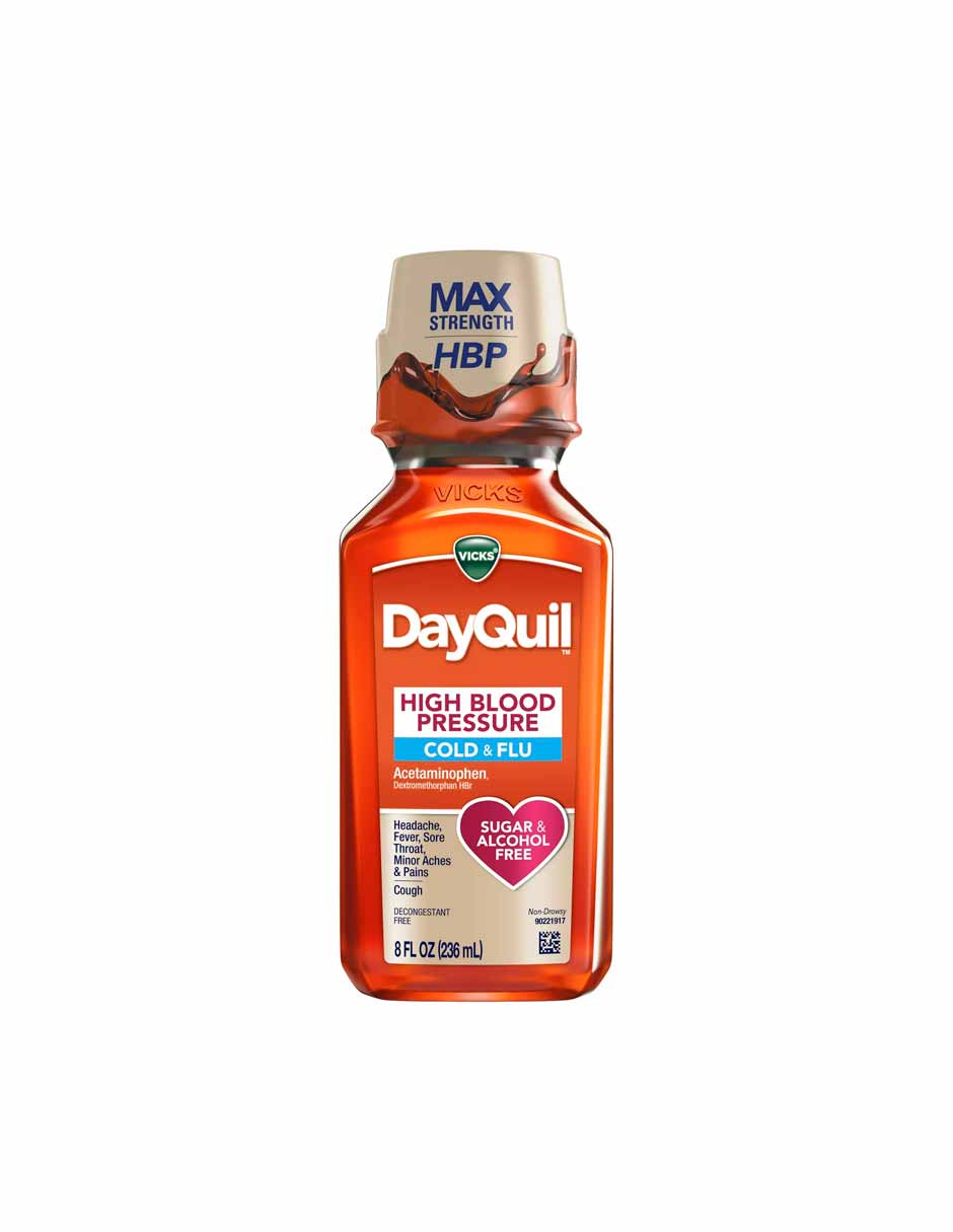 El medicamento líquido para la presión arterial alta, el resfriado y la gripe DayQuil alivia temporalmente los síntomas comunes del resfriado y la gripe para que pueda continuar con su día.
