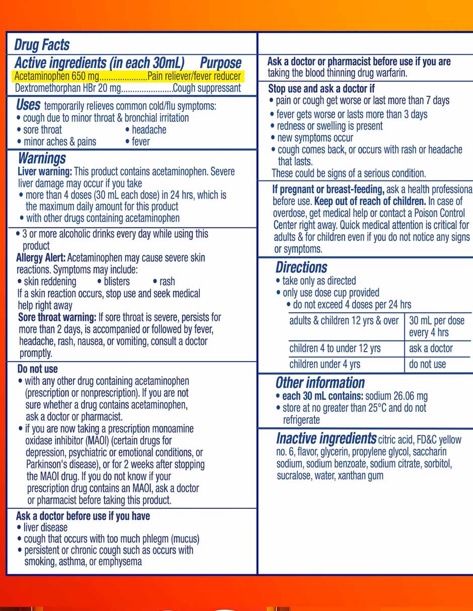 Acetaminofeno 650 mg, Dextrometorfano HBr 20 mg. Ingredientes inactivos: Ácido cítrico, FD&C amarillo n.° 6, saborizante, glicerina, propilenglicol, sacarina sódica, benzoato de sodio, citrato de sodio, sorbitol, sucralosa, agua, goma xantana.