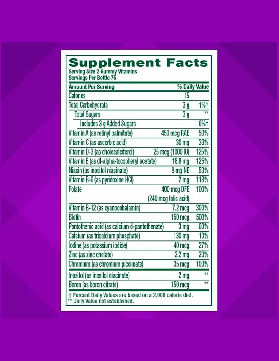 Una botella de 150 unidades de gomitas multivitamínicas para mujer vitafusion, suficientes suplementos dietéticos para 75 días de vitaminas diarias.