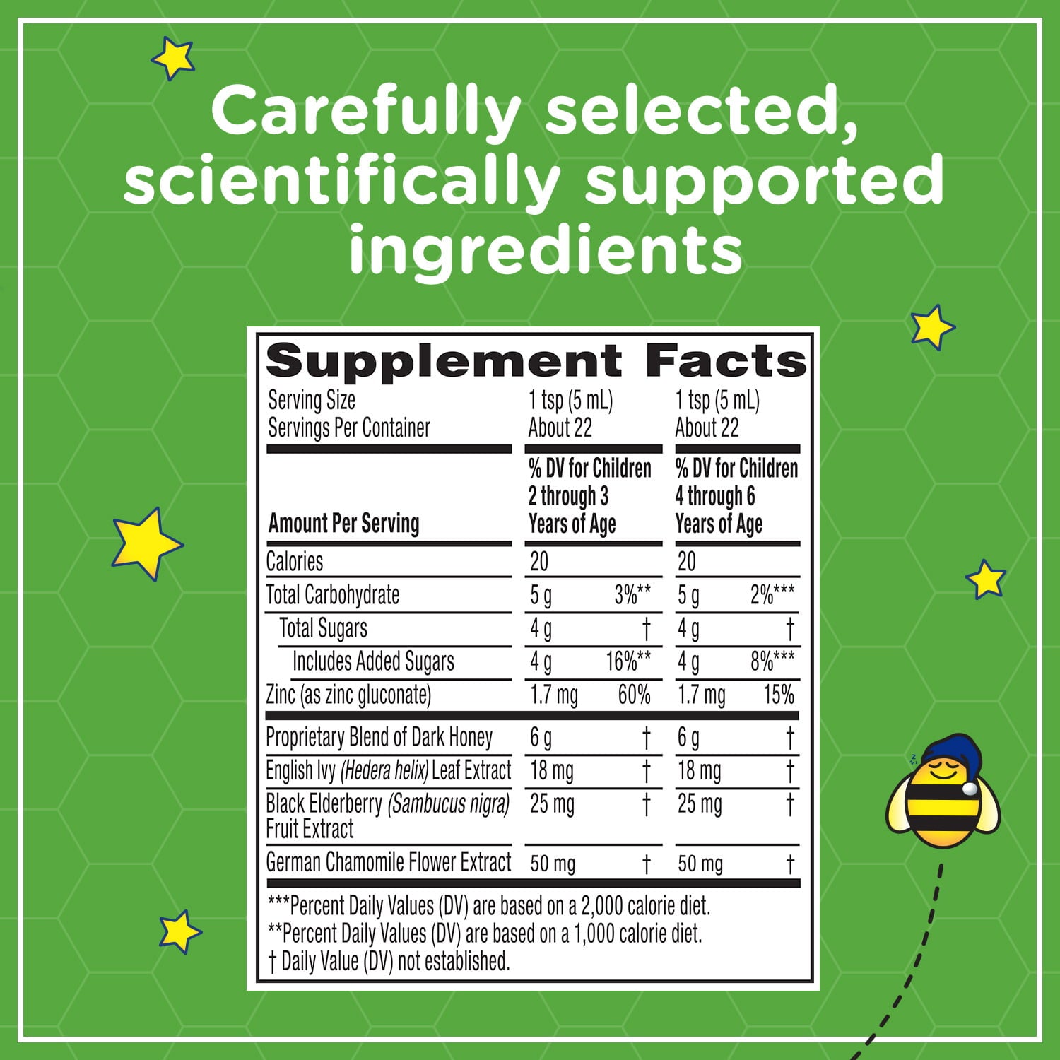 Kids Cough + Mucus Syrup Nighttime de Zarbee's está diseñado específicamente para niños de 2 a 6 años con ingredientes cuidadosamente seleccionados y respaldados científicamente, como miel oscura, que ha demostrado que alivia la tos, y hoja de hiedra, que ayuda a eliminar la mucosidad al toser, zinc y extracto de saúco para apoyo inmunológico. y manzanilla para calmar el cuerpo y la mente antes de dormir.*. Endulzado naturalmente, el único azúcar en nuestras botellas proviene de nuestra miel oscura calmante, a los niños les encantará el sabor natural de bayas mixtas. De la marca de jarabe para la tos n.º 1 recomendada por pediatras, los jarabes para la tos de Zarbee son una forma segura y eficaz de calmar la tos asociada con la ronquera y los irritantes. Libre de drogas, alcohol, edulcorantes artificiales, sabores o colorantes agregados, o jarabe de maíz con alto contenido de fructosa. Apto para alérgenos: sin gluten, lácteos, huevos ni cacahuetes. *Estas declaraciones no han sido evaluadas por la Administración de Alimentos y Medicamentos. Este producto no está destinado a diagnosticar, tratar, curar o prevenir ninguna enfermedad.